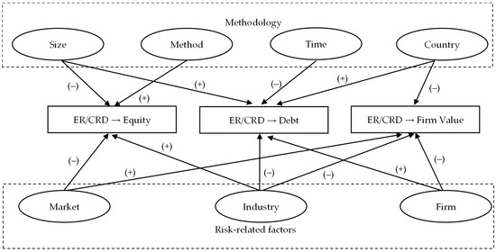 Table 5 shows the MASEM results of three models on the ER/CRD–equity, ER/CRD–debt, and ER/CRD–value relationships. The results of size, method, time, and country show the effects of methodology, while the results of market, industry, and firm show the risk effects on the three relationships.