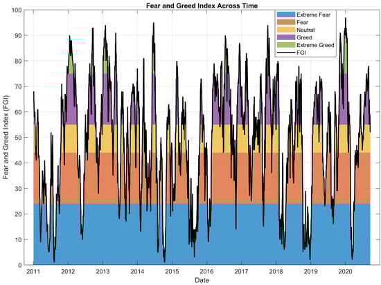 This graph reports the time series plot of FGI across time and shows the disparity between various sentiment levels. Extreme fear is defined as FGI ≤ 24, fear is defined as 25 ≤ FGI ≤ 44, neutral is defined as 45 ≤ FGI ≤ 55, greed is defined as 56 ≤ FGI ≤ 75, and extreme greed is defined as FGI ≥ 76.