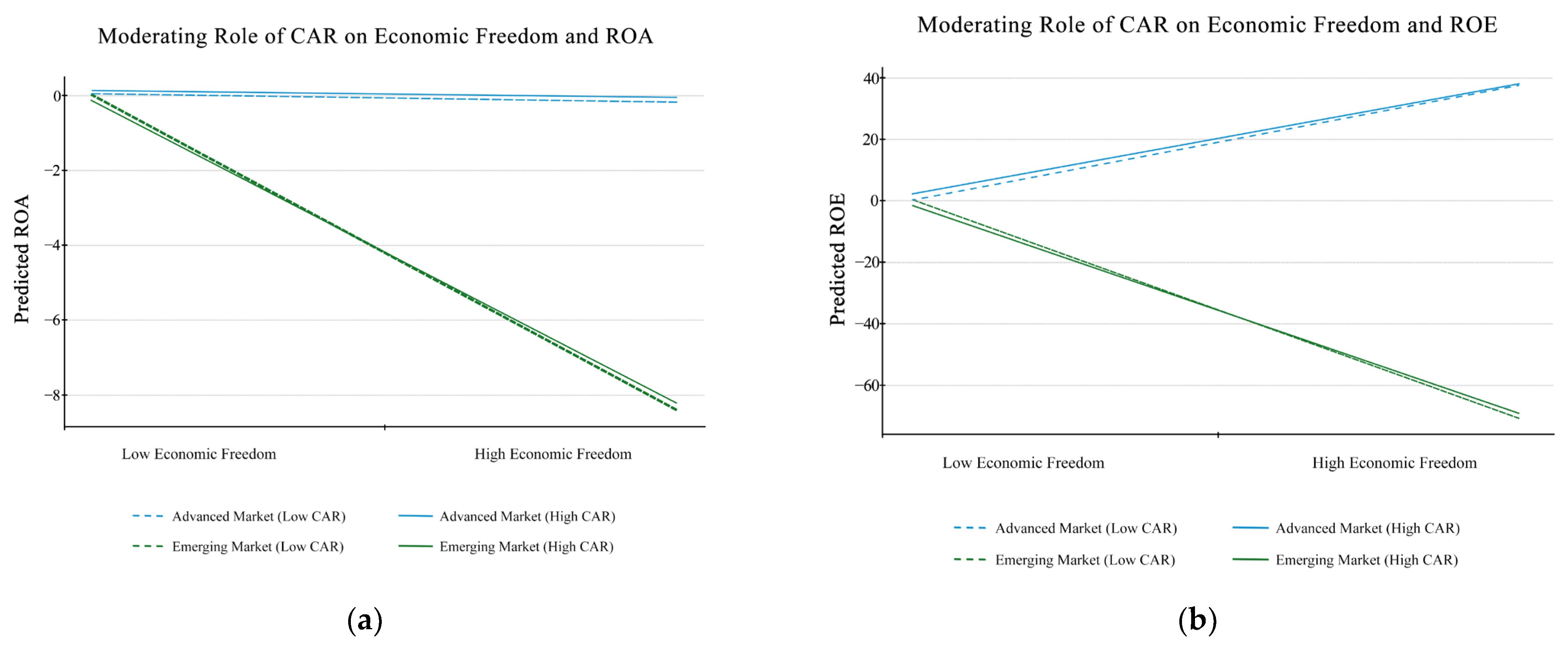 Overall, these findings highlight the role of regulatory capital in supporting bank resilience under liberal economic conditions, particularly in emerging markets. Although the moderating effect of CAR is less pronounced in advanced economies, it remains directionally consistent and underscores the importance of capital adequacy standards in mitigating systemic risk. Full regression results underlying these visualizations are presented in
