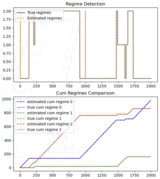 As shown in Figure 1, the algorithm accurately captures the evolution of hidden regimes from both regime detection plot and cumulative regimes comparison plot.