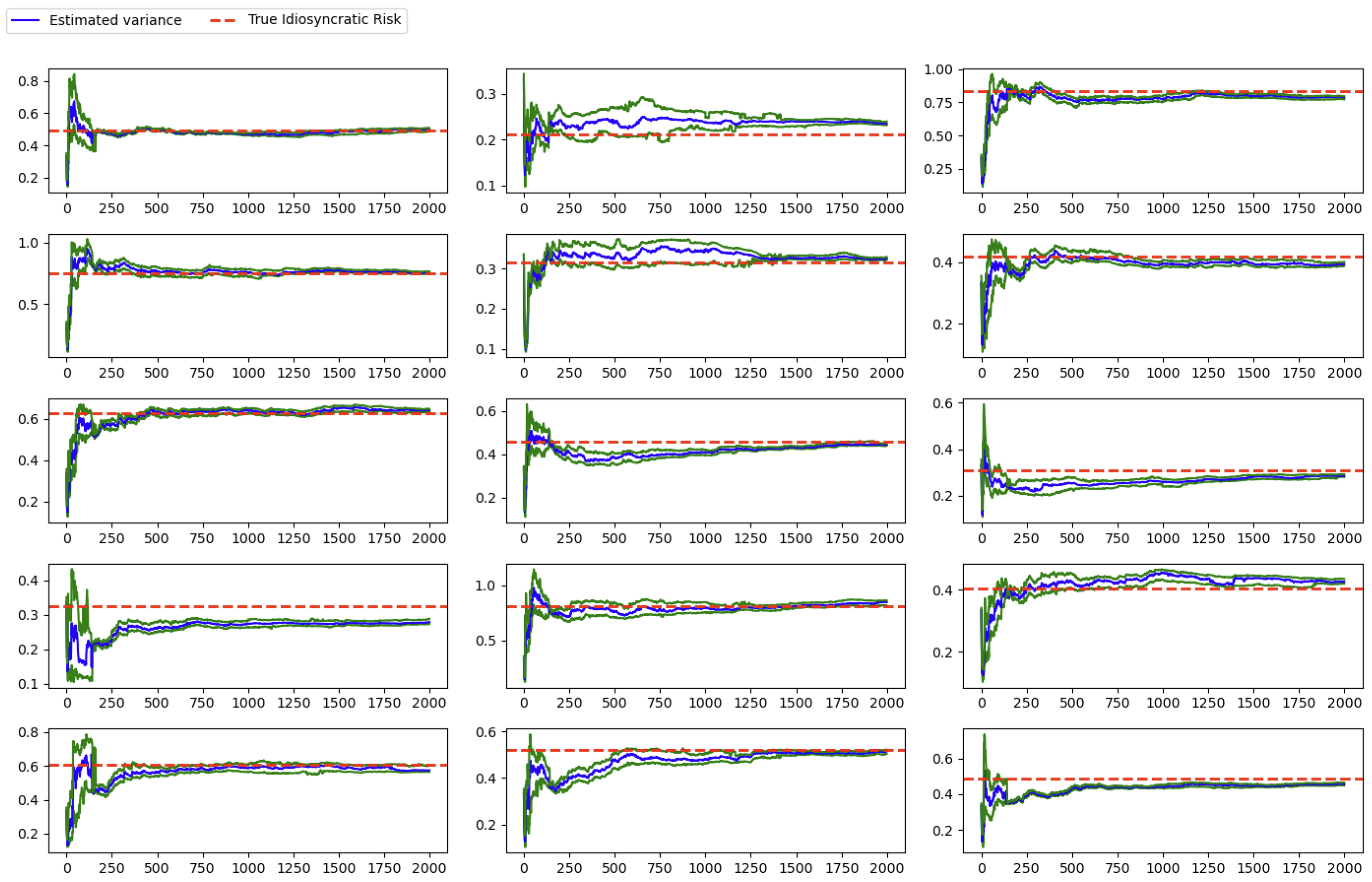 In the above graphs, the effective sample size (ESS) is used to measure the stability of particle filtering algorithm in real data, and defined as: