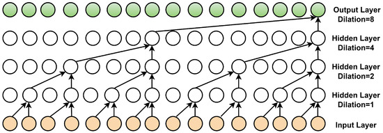 In a TCN, the input sequence passes through convolutional layers, where each layer applies filters to extract relevant temporal patterns. Unlike traditional convolutional networks, TCNs use dilated convolutions, introducing fixed gaps between filter elements. By progressively increasing the dilation rate across layers (e.g., d = 1, 2, 4, 8), TCNs can capture dependencies over longer time horizons without incurring significant computational overhead. To enforce causality, padding is applied so that each output in a time step t depends only on inputs from time steps , preventing information leakage from future inputs (Li et al., 2024). Figure 1 illustrates how dilated convolution expands the receptive field by increasing dilation rates across layers.