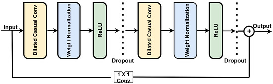 A key component of TCNs is the residual module, which facilitates the training of deep networks. Figure 2 shows that each module begins with a dilated causal convolution that ensures that temporal order is preserved by restricting output to past inputs.