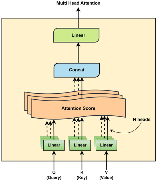 The attention mechanism enables the model to focus on the most relevant features while reducing the impact of less important ones, thereby improving performance. To enhance this capability, the attention module operates in parallel through multiple attention heads, each learning different aspects of the input independently. To enable this, the module divides the query (Q), key (K), and value (V) parameters into N distinct parts. Each part is independently processed by a separate attention head, allowing the model to capture different contextual relationships within the input. The outputs from all heads are then concatenated and combined to produce the final output of attention (Luo et al., 2024; Wang & Peng, 2024). Figure 3 illustrates the architecture of the multi-head attention mechanism.