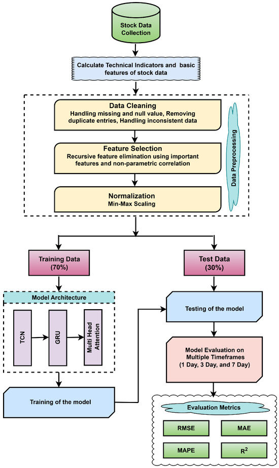 The figure illustrates the end-to-end workflow of the proposed stock price prediction framework. The process begins with collecting historical stock data and computing 36 features. These raw data are then subjected to cleaning and normalization to ensure consistency across features. Next, feature selection is performed using a combination of model-based importance scores and statistical correlation analysis. Specifically, feature importance is derived by averaging the scores from two ensemble learning models: the random forest (RF) regressor and the gradient boosting (GB) regressor. In parallel, Kendall tau correlation is employed to evaluate the statistical relationship between each feature and the target variable. Both sets of scores are scaled and combined using a weighted scheme assigning weight to the model-based scores and to the Kendall correlation scores. The resulting composite scores are used to identify the top 15 most relevant features, as detailed in Section 3.3.2. After preprocessing, the dataset is split into training () and test () subsets. The refined data are then fed into a hybrid DL model that integrates the TCN, the GRU, and MHA. This architecture effectively captures short-term fluctuations and long-term temporal dependencies in the time-series data. The model is trained and evaluated across multiple forecast horizons, specifically 1-day, 3-day, and 7-day intervals, using appropriate performance metrics to assess predictive accuracy.