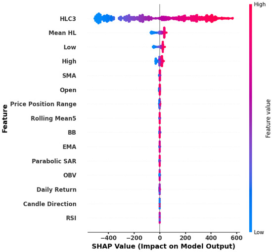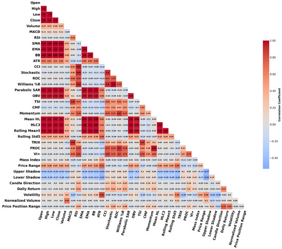 This study used three different stock datasets and two indices. Among them, the HDFC Bank dataset was selected for visualization and feature importance analysis, as it exhibited correlation structures and feature importance rankings similar to the other datasets. Therefore, analyzing HDFC Bank alone was sufficient to reveal the underlying patterns in all datasets. Figure 5 represents the correlation heatmap of the parameters for the HDFC Bank dataset. The graphic illustrates the pairwise correlation coefficients among 36 features. Stronger positive correlations are shown in dark red, whereas strong negative correlations are shown in blue, facilitating the easy detection of linear connections among features.
