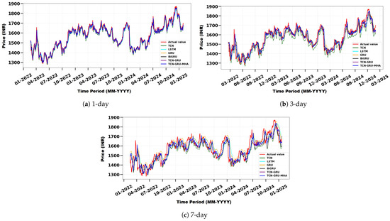 We evaluate the proposed model, TCN-GRU-MHA, against baseline models—TCN, LSTM, GRU, BiGRU, and TCN-GRU—across different prediction horizons: 1 day, 3 days, and 7 days. Table 5 presents the evaluation results based on the metrics RMSE, MAE, MAPE, and , providing a comprehensive comparison of the models in terms of predictive accuracy and error reduction. In this work, RMSE, MAE, and MAPE are treated as scaled error measures, whereas represents the actual performance outcome as it quantifies the proportion of variance explained by the model. For the 1-day forecast, the proposed model performs the best, with an RMSE of 0.014, an MAE of 0.008, an MAPE of 1.21%, and an score of 0.981. These results show that the model is highly accurate in capturing short-term changes. The next best model, TCN-GRU, shows slightly higher errors and a lower of 0.978, while traditional models such as LSTM and TCN perform less effectively. The 3-day forecast shows that the proposed model gives the best results, with an RMSE of 0.031, an MAE of 0.022, an MAPE of 2.40%, and a of 0.948. This means that the model remains accurate for a longer period of time. TCN and LSTM, on the other hand, perform worse, with lower scores (0.892 and 0.901) and higher error values. For the 7-day forecast, although the prediction uncertainty increases, the proposed model still leads, with an RMSE of 0.072, an MAE of 0.051, an MAPE of 5.10%, and an of 0.849. Despite a slight drop in performance, it outperforms TCN-GRU (0.846) and GRU (0.834) and significantly surpasses TCN (0.803), confirming its robustness across varying forecast horizons.