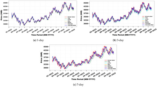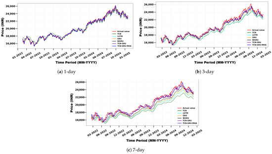 Comparison of actual and predicted Nifty 50 index prices using TCN, LSTM, GRU, BiGRU, TCN-GRU, and the proposed model for different forecast horizons: (a) 1 day, (b) 3 days, and (c) 7 days.
