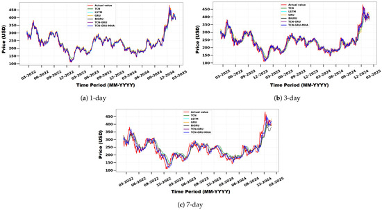 Comparison of actual and predicted TSLA stock prices using TCN, LSTM, GRU, BiGRU, TCN-GRU, and the proposed model for different forecast horizons: (a) 1 day, (b) 3 days, and (c) 7 days.