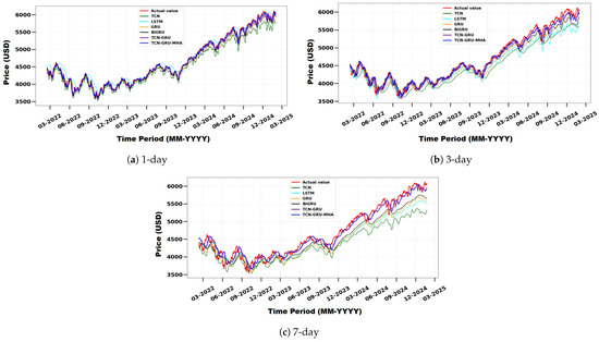 Comparison of actual and predicted S&P500 stock prices using TCN, LSTM, GRU, BiGRU, TCN-GRU, and the proposed model for different forecast horizons: (a) 1 day, (b) 3 days, and (c) 7 days.