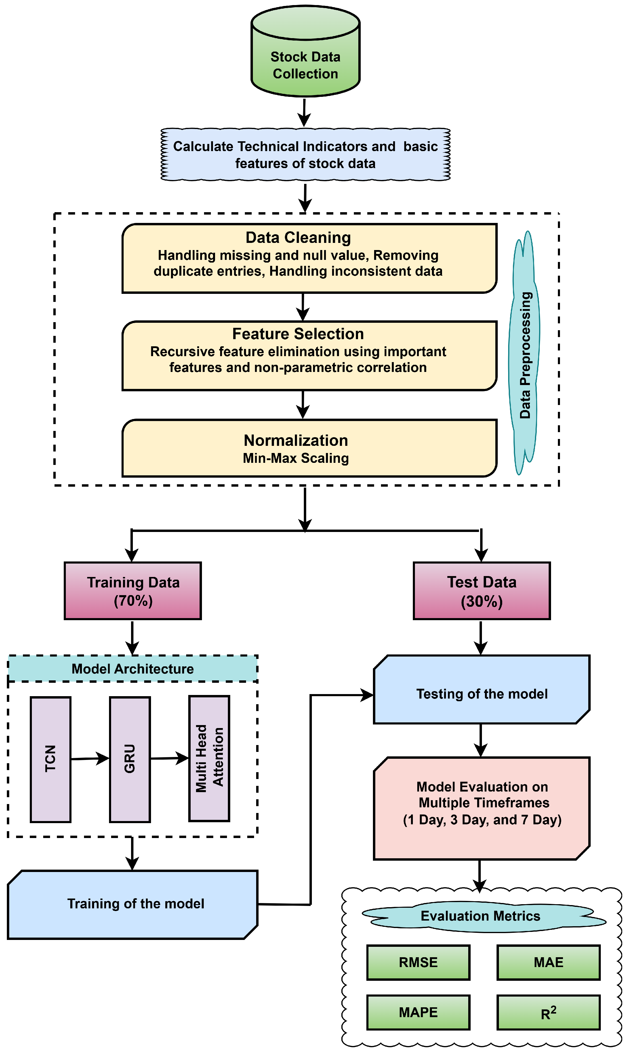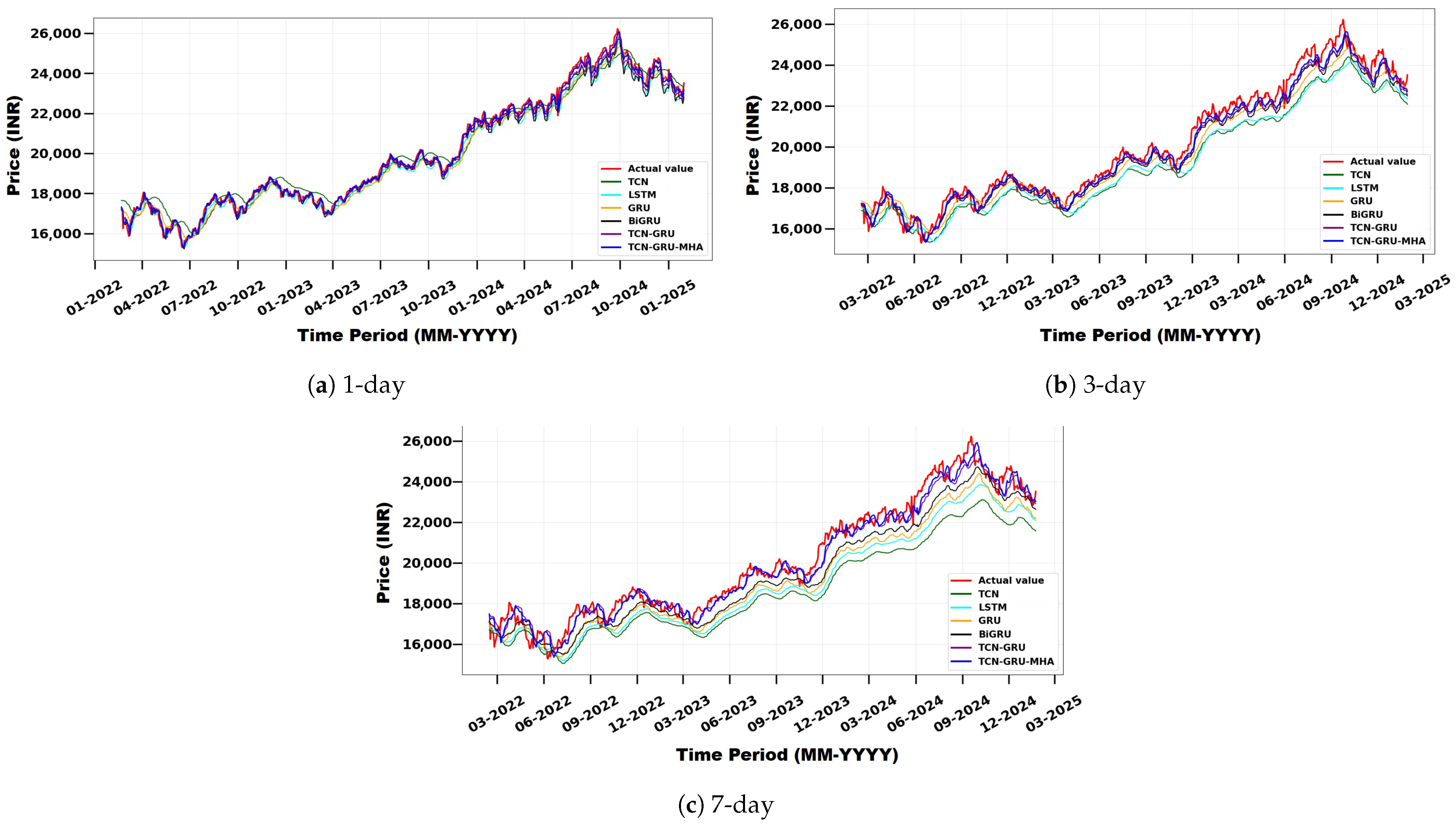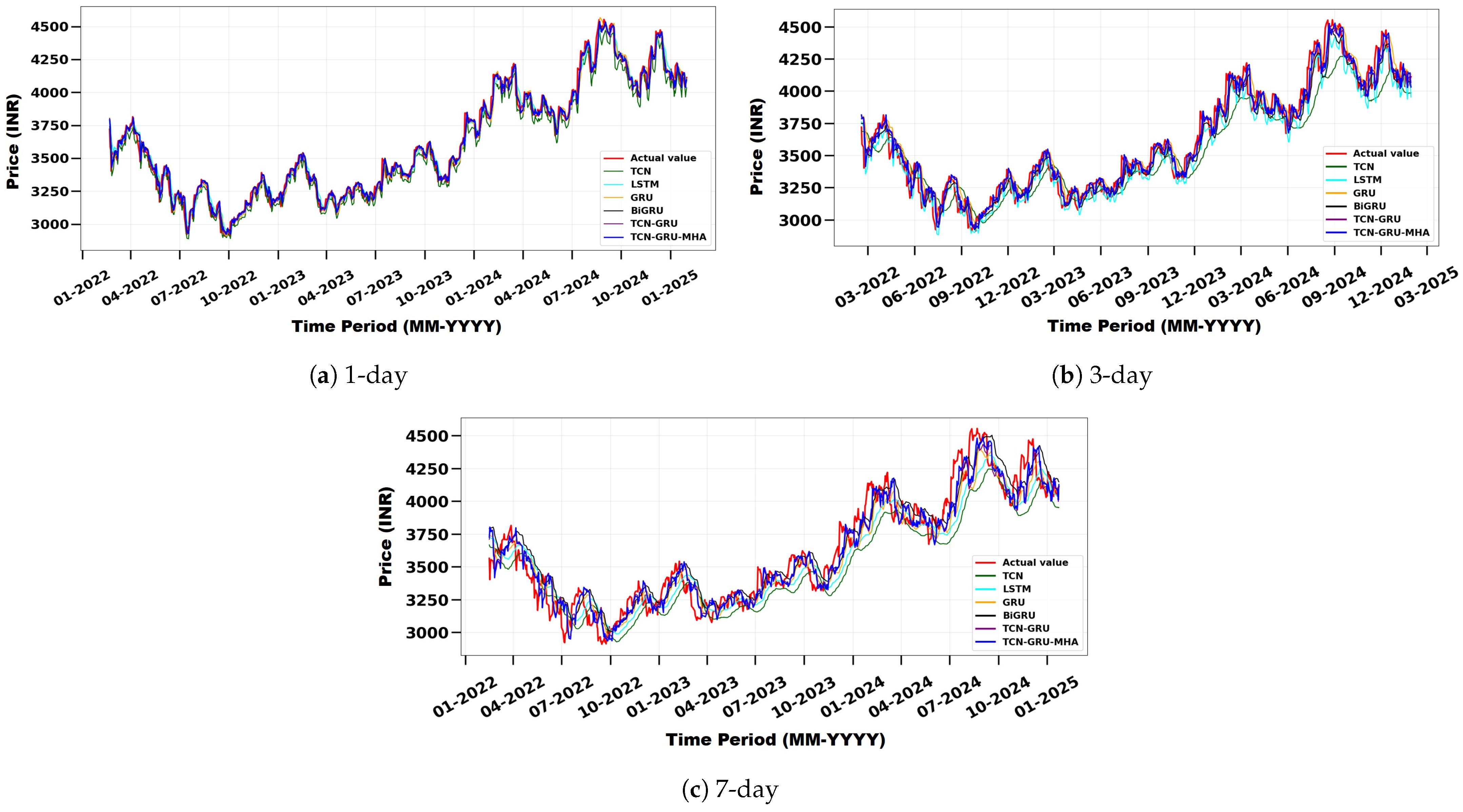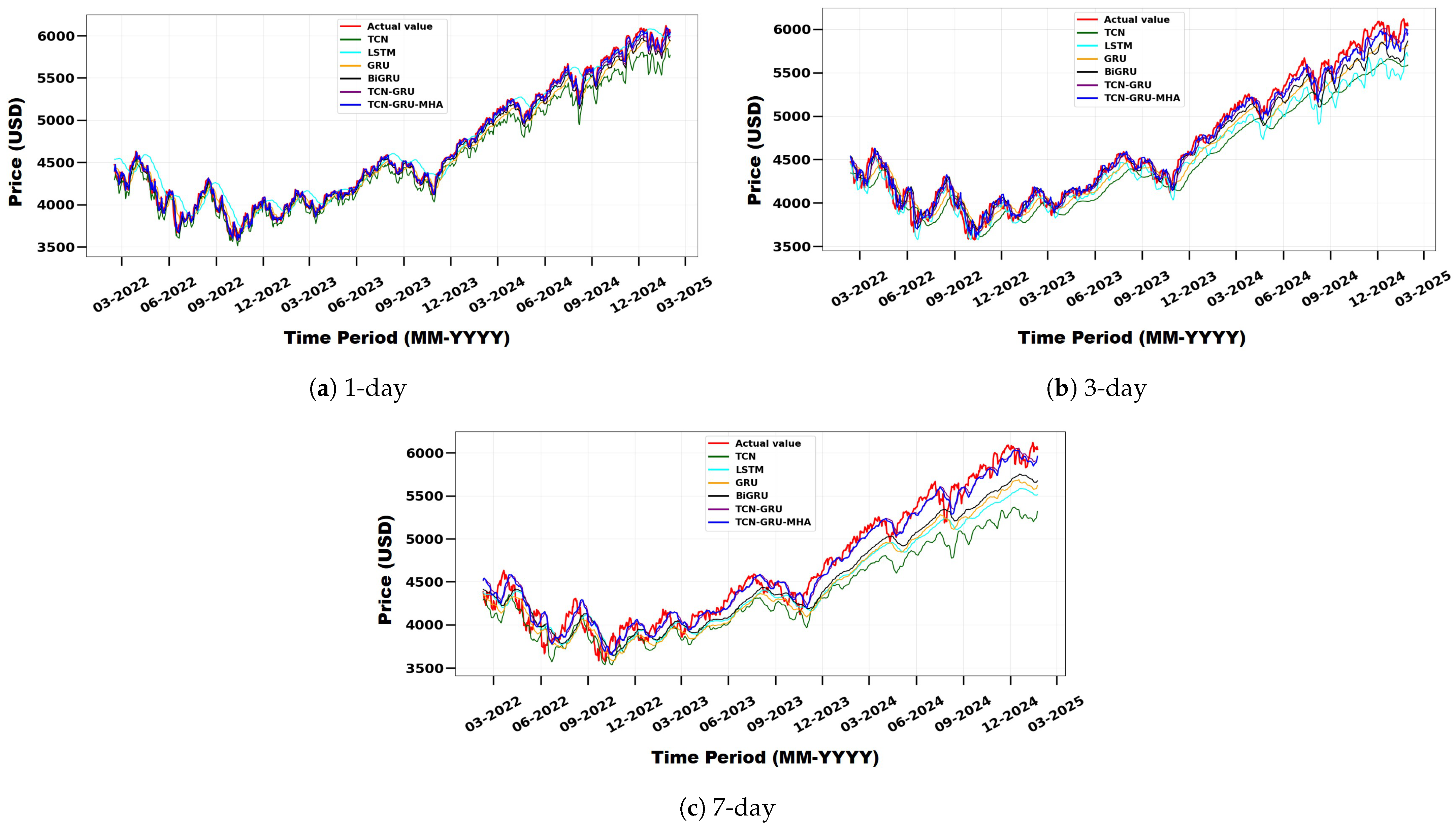 - Demonstration of the superior predictive accuracy of the proposed model, TCN-GRU-MHA, compared with traditional short-term stock price forecasting methods across multiple horizons (1-day, 3-day, and 7-day).