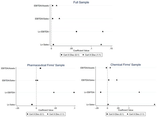 Environmental Certification Effects on Firm Performance by Sector. Coefficient plots.