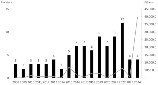 The country where the most fintech M&A deals have been announced is by far the United States, with a total of 50 transactions between 1 January 2008 and 1 July 2024, followed by Brazil with 7 and Japan with 4 (Figure 1). Altogether, the number of deals announced by European buyers reaches 19 transactions. Moreover, in 2024, the total value of deals spikes to an extremely high level as the Local indices sample includes the acquisition of Discover Financial Services by Capital One Financial Corporation, whose deal value alone is equal to ~US$USD 35.3 billion (Figure 2). Finally, descriptive statistics of the deal values of the transactions are described in Table 3.