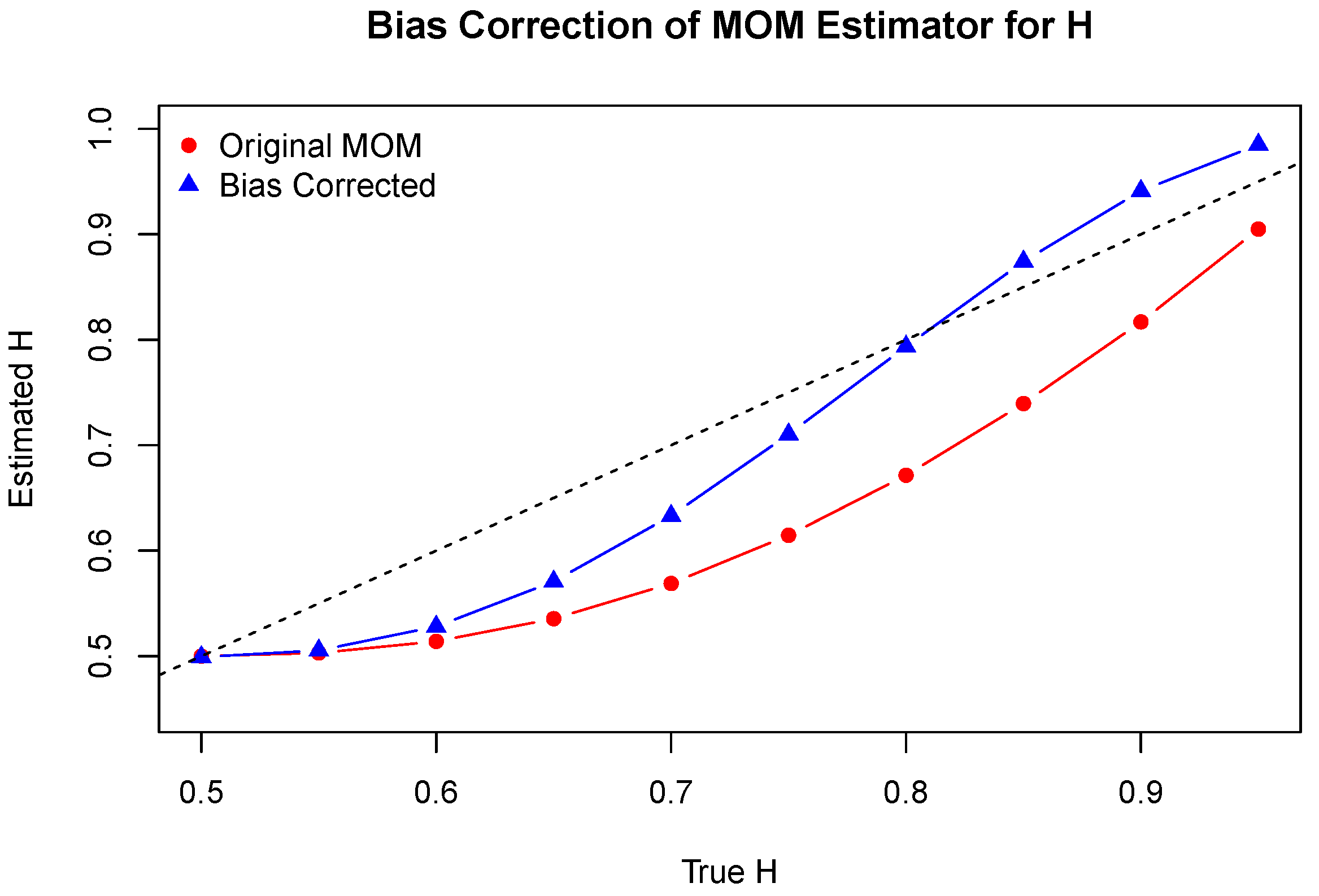 Figure 5 shows a comparison between the original and bias-corrected MOM estimates of the Hurst parameter. The corrected estimates (blue triangles) lie substantially closer to the identity line
