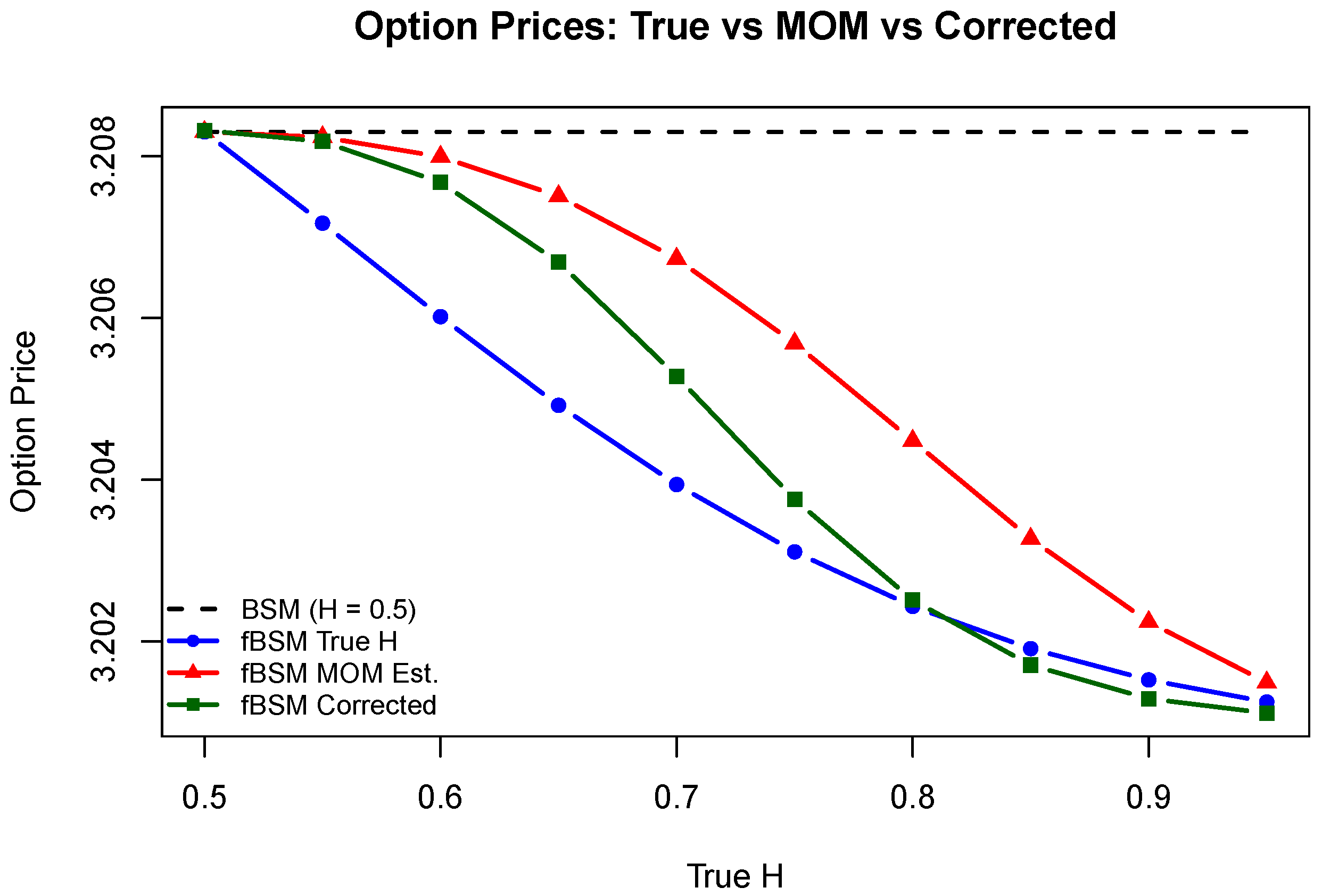, where the original MOM bias was most pronounced. Overall, these results confirm that the proposed bias correction not only improves the statistical properties of the estimator but also enhances the practical accuracy of option pricing under the fractional Black–Scholes framework.
