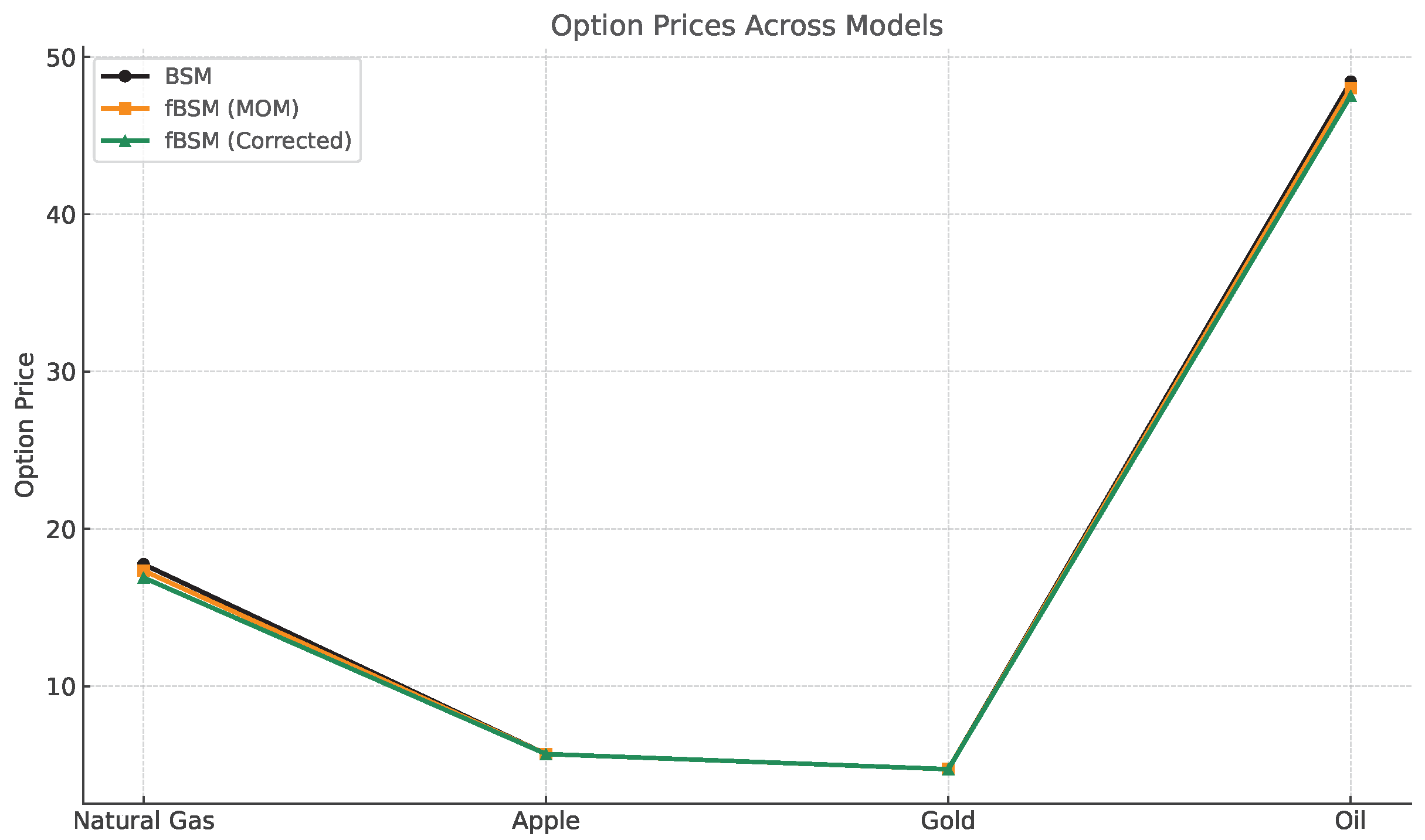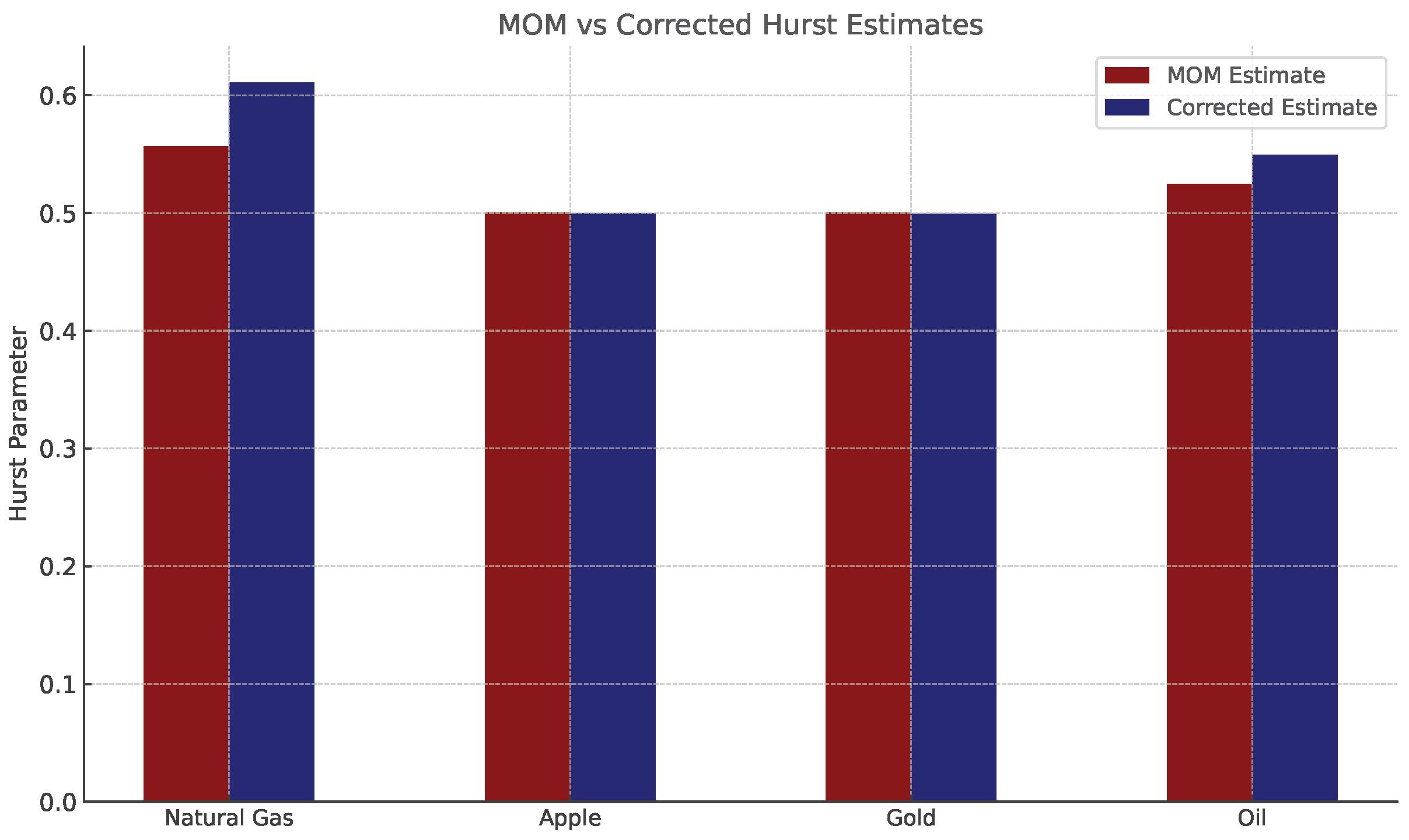 In sum, bias correction improves the reliability of Hurst parameter estimation, reduces option pricing error, and provides practitioners with a more robust framework for trading and hedging in long-memory markets. For Apple and Gold, corrections yield minimal changes, whereas for Natural Gas and Oil, pricing gaps of 0.4–0.5 units (equivalent to USD 40–USD 50 per contract under standard multipliers) highlight the tangible financial significance of accurate Hurst parameter estimation in volatile markets.