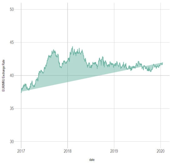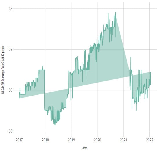 All codes and estimations were executed within R, ensuring full transparency and reproducibility of the empirical results. The exchange rate of the EURO and the USD, respectively, against Ouguiya are presented in the following graphics (Figure 1, Figure 2, Figure 3, Figure 4, Figure 5 and Figure 6):