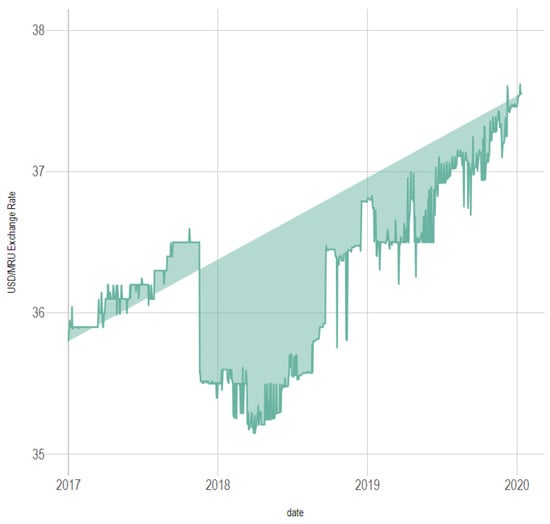 The currency of Mauritania is the Ouguiya (MRU), and its official exchange rate regime is floating (IMF, 2020). The Central Bank of Mauritania (BCM) intervenes to stabilize the exchange rate and maintain its official reserves, publishing daily on its website the total market bids and asks, the amounts settled at the fixing rate, and a summary of market turnover. Since May 2020, the MRU has appreciated within a 2% band against the US dollar, making the de facto exchange rate regime a “crawl”-type system (IMF, 2020).