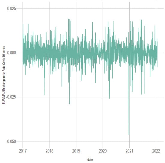 Both the EUR/MRU exchange rate in the first and second period (COVID-19) pass the ADF test for stationarity, as indicated by their highly negative Dickey–Fuller statistics and p-values of 0.01 (see Table 5 and Table 6).