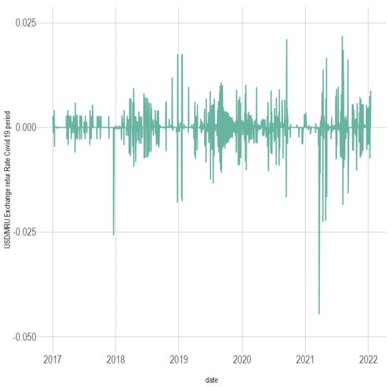 During the pre-COVID period (see Table 3), the USD/MRU exchange rate showed an average daily return of 0.0000470, a negative skewness of −0.76, and a high kurtosis of 16.91, indicating frequent extreme negative returns and pronounced leptokurtosis. In contrast, during the COVID-19 period (see Table 4), the mean return declined to 0.000019, while volatility increased (SD = 0.00347). The return distribution became more negatively skewed (−1.73) and highly leptokurtic (kurtosis = 29.43), confirming that the pandemic amplified volatility, downside risks, and extreme price fluctuations in the USD/MRU market.
