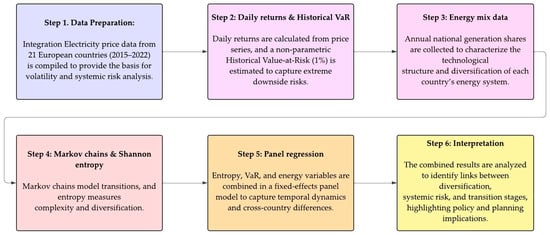 This study adopts a methodological approach consisting of three interrelated stages. In the first stage, the risk associated with electricity prices is estimated by calculating the VaR for each country and year of the analysis period. In the second stage, these risk indicators are linked to the structure of the national energy matrix, evaluating their temporal evolution using Markov chain models. This procedure allows for the construction of an entropy indicator, which quantifies the uncertainty associated with energy transition processes. In the third and final stage, both the entropy indicator and other explanatory variables are incorporated into a panel data model with fixed effects. This approach allows for the study of energy risk from a quantitative perspective, incorporating both the temporal dimension and structural heterogeneity across countries.