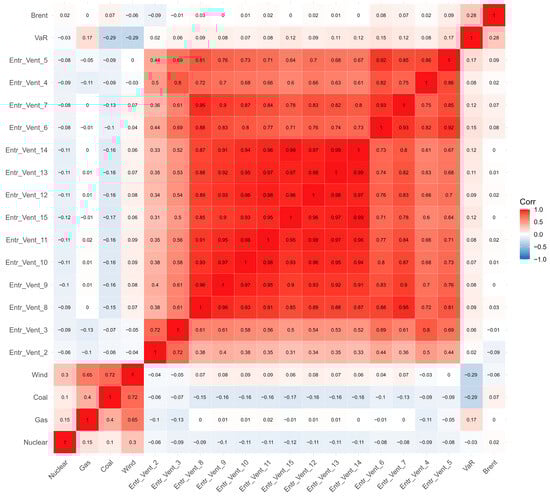 The correlation matrix (in Figure 2) shows heterogeneous relationships among the variables. The Entr_Vent series exhibit very strong positive correlations with each other, suggesting that they capture highly related dynamics. In contrast, traditional energy variables such as Brent, Coal, Gas, and Nuclear display weak or negligible correlations with the Entr_Vent group, indicating a low degree of direct association. Wind appears moderately correlated with Coal and Gas, while the VaR indicator maintains only weak connections across most variables. Overall, the plot highlights clusters of strongly interrelated variables alongside others that behave more independently.