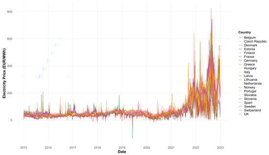 Figure 3 shows how electricity prices, expressed in euros per megawatt-hour (EUR/MWh), evolved daily in 21 European countries between 2015 and 2022. The horizontal axis represents the passage of time, while the vertical axis captures price values, ranging from negative levels to over 800 EUR/MWh. Although the superposition of multiple curves makes it difficult to trace each trajectory separately, the figure clearly illustrates the main disruptions and structural changes that marked the European electricity market during this period. The visualization allows for the identification of both gradual trends and abrupt shocks, highlighting the complex interplay of market mechanisms and external factors in determining electricity prices.