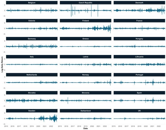 In the first stage of the analysis, the daily returns on electricity prices are calculated. These are obtained by logarithmically transforming consecutive prices, which allows us to work with a measure of relative variation, stabilize the variance, and facilitate the interpretation of the results in percentage terms. The formula used is the one defined in (1), where represents the daily return for country i on day t, and is the observed price.