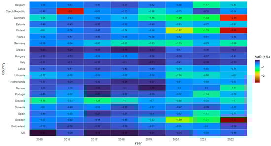 The VaR is interpreted as a measure of the worst-case outcome under a given confidence level (99% in this case) and allows us to capture the magnitude of electricity price risk for each country and year. The output of this stage is a balanced panel-structured database with 168 observations (21 countries × 8 years), where each observation represents a country’s annual risk. This design facilitates cross-sectional and time-based comparisons and lays the groundwork for subsequent econometric analyses.