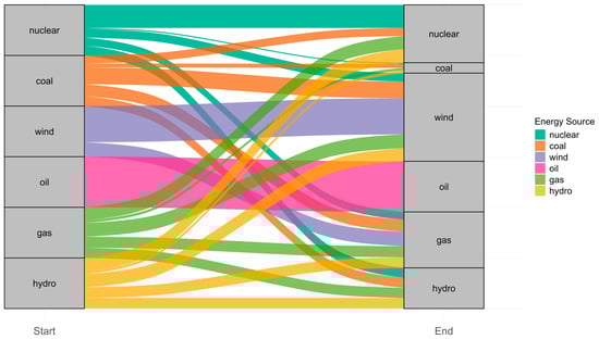 Once the database has been transformed into this reduced structure, an initial estimate of the general energy transition matrix is made. This matrix descriptively represents how changes in the primary source of generation have occurred between consecutive years for all countries included in the study. For example, if a country’s primary source was gas in 2016 and switched to solar energy in 2017, a “gas → solar” transition is recorded. Repeating this process for all countries and all available years yields a matrix indicating the number of times each type of transition (from one source to another) has occurred, thus allowing us to observe how European countries have transitioned between different energy sources over time.