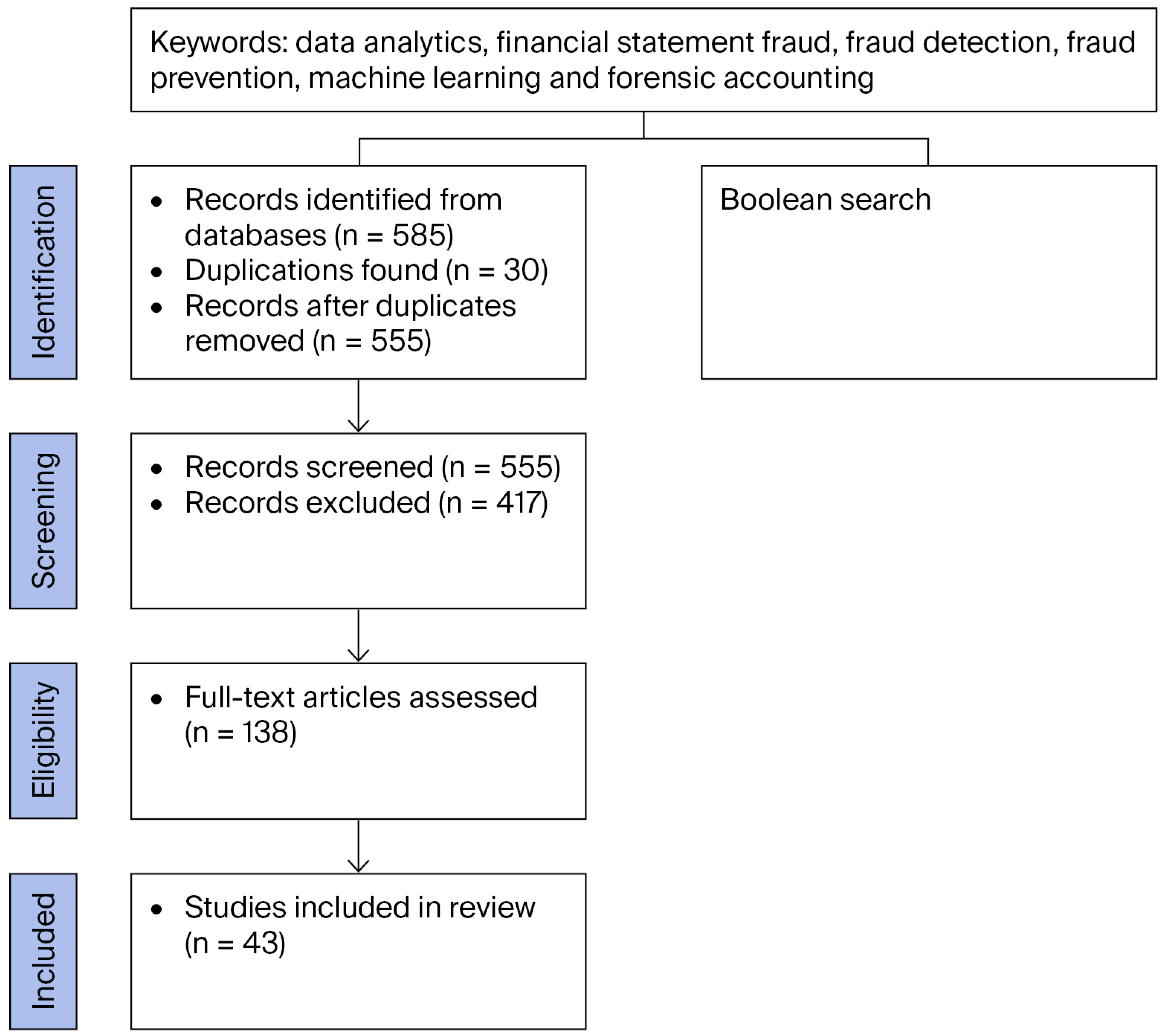 - Records excluded (irrelevant topic, not peer-reviewed, wrong fraud type, etc.): n = 417.