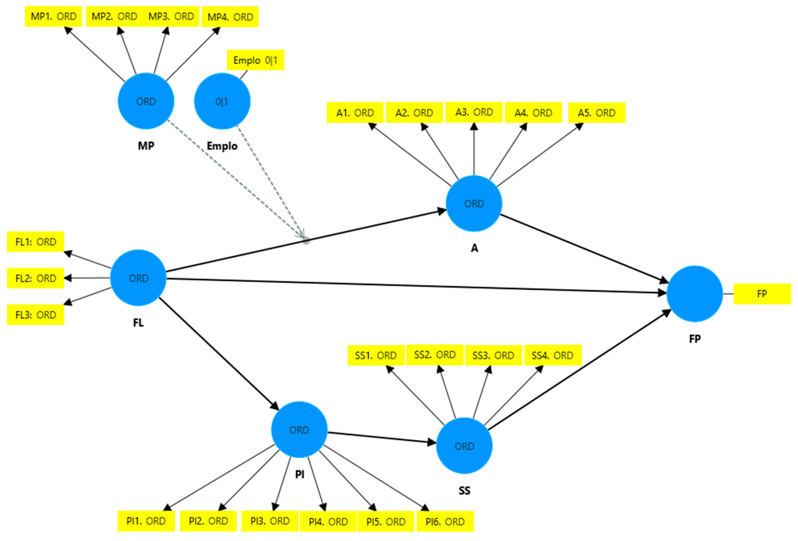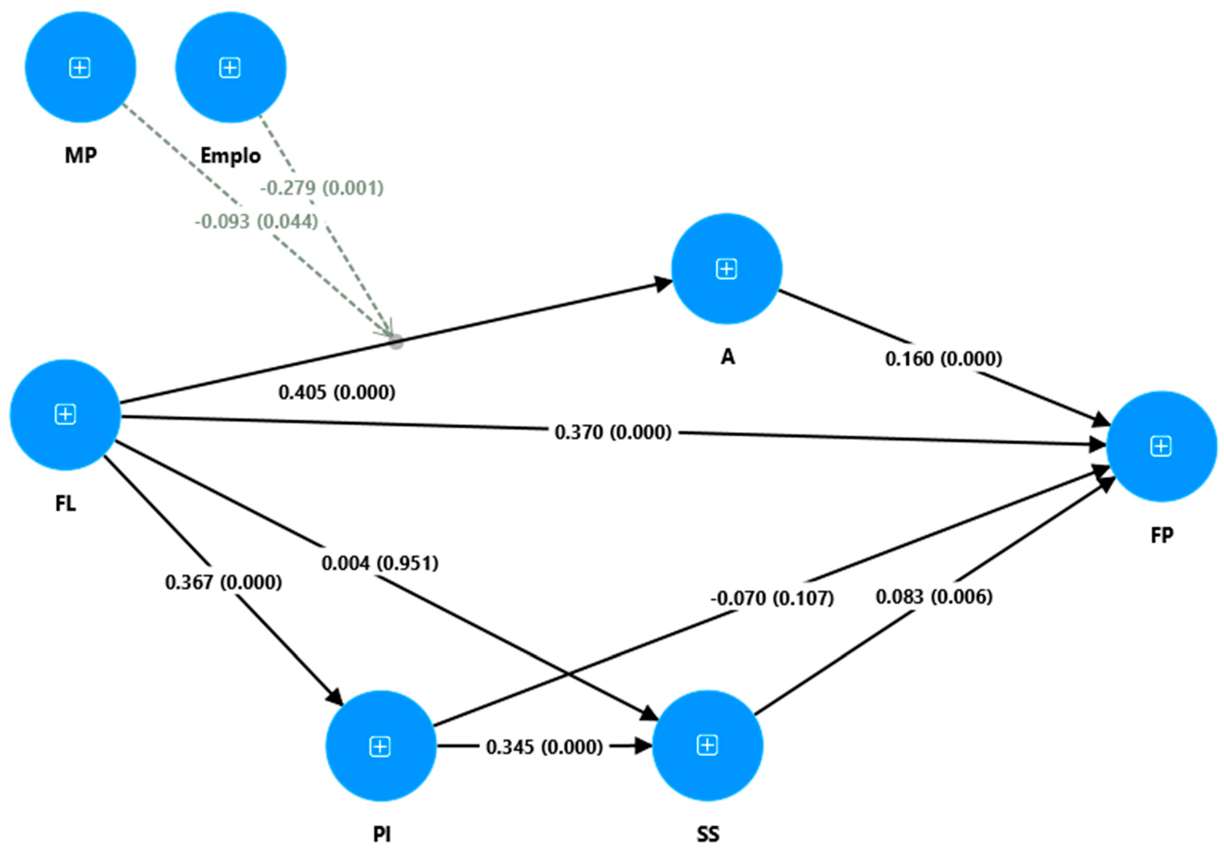 | Moderated Mediation (Emplo × FL) | Emplo x FL -> A -> FP | −0.045 | 0.018 | Significant at 5% |