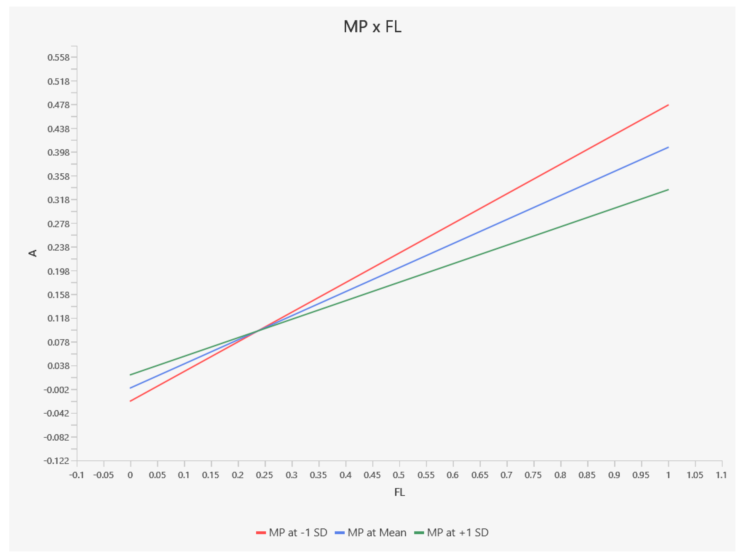 | Moderated Mediation (MP × FL) | MP x FL -> A -> FP | −0.015 | 0.059 | Insignificant at 5% |