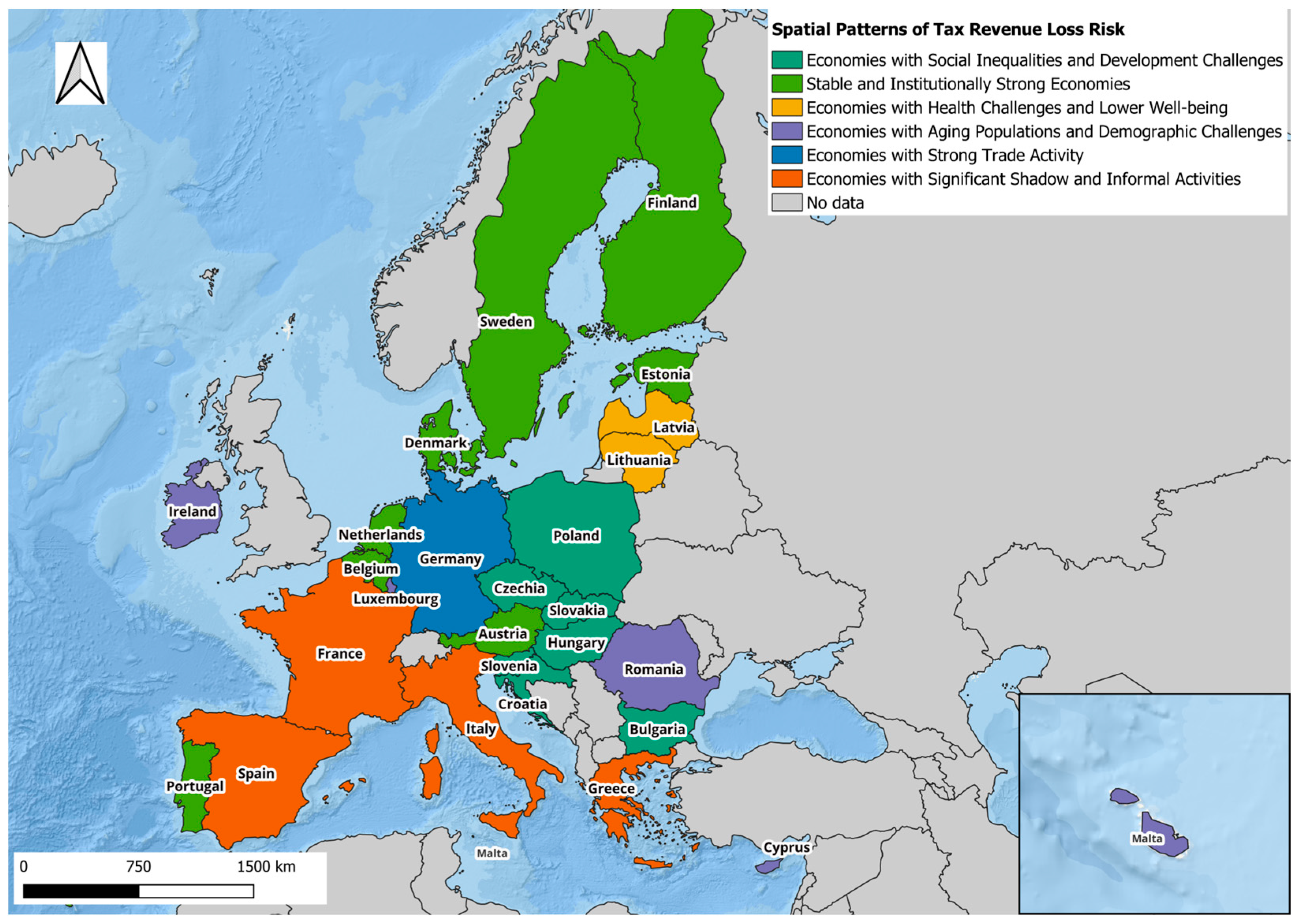 | Spatial Patterns | Risk of Tax Loss (%) | Member States | Institutional and Economic Stability | International Trade and Market Share | Socio-Economic Inequality and Tax Burdens | Health and Well-Being | Demographic Aging and Social Dynamics | Tobacco Taxation Policy | Labor Dynamics and Shadow Consumption |