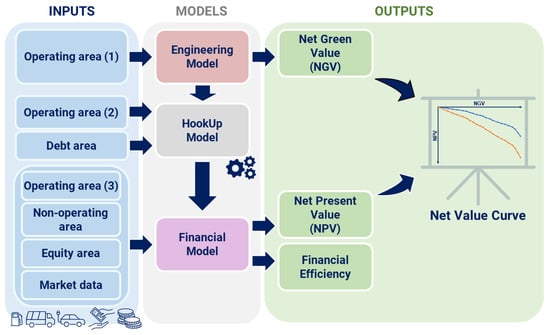 The Financial model employs the outputs generated by the HookUp model along with the remaining inputs. It processes these combined data and organizes them into pro forma financial statements (presented as a strip of Split-Screen Matrices), whence the financial evaluation is obtained, with NPVs, rates of return, and financial efficiencies. Then, we concentrate on the NPV and the NGV, directly derived from the Engineering model. Plotting the five NPV-NGV pairs on an xy-plane, we obtain the main output of the whole system: the Net Value curve. This curve represents a Pareto frontier, balancing the trade-off between the NPV and the NGV.