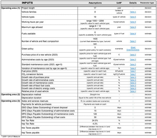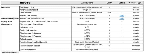 In total, we have managed 2303 inputs (see Figure 2 and Figure 3): most of them are quantitative inputs with a few qualitative inputs (e.g., vehicle families or types, depreciation method, debt amortization method). This means that the size of the problem is substantial, posing significant computational complexity in logical and computational terms. Inputs are categorized as either “estimate” or “decision” variables and are segmented into five areas: operating, debt, non-operating, equity, and market data.3 The operating inputs are broken down into three classes, according to the model that processes them: some feed into the Engineering model, some into the HookUp model, and others into the Financial model (see Figure 1 and Figure A1 in the Appendix A).4 The inputs within the operating area undergo a nontrivial processing, determining the policy of vehicle replacement and the annual composition of the fleet, and, hence, impacting on Iren Ambiente’s operating assets, operating income, and operating cash flow. The inputs in the debt area pertain to Iren Ambiente’s borrowing policy to finance the acquisition of new vehicles. The inputs of the equity and non-operating areas relate to Iren Ambiente’s payout policy affecting the amount of cash flow distributed to equityholders and, consequently, the amount of cash flow retained in the firm. The market data inputs provide estimates for the costs of capital, specifically the required return on operating assets (unlevered cost of assets), the required return on non-operating (liquid) assets, and the required return on debt. All assumptions have been made with the assistance of Iren Ambiente’s engineers and executives or inferred from IREN’s internal documents (e.g., the payout ratio).