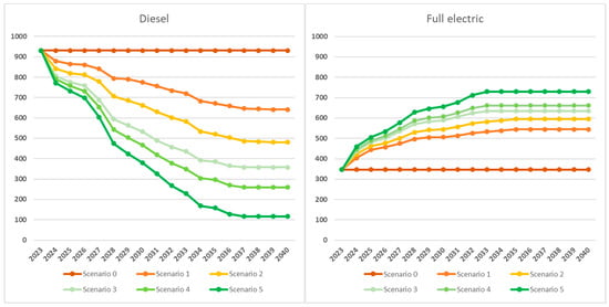 Number of vehicles by scenario and by year (Diesel and Full electric).