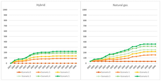 Number of vehicles by scenario and by year (Hybrid and Natural Gas).