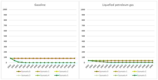 For each scenario and for each vehicle type, a starting year is defined: before this year, vehicles are replaced with a new vehicle of the same type and fuel; from the starting year onward, purchases of new vehicles follow the selected vehicle replacement policy (Figure A4 and Figure A5 and Figure 5 below). For example, consider Scenario 4 in Figure 5. If we consider the medium-rear-loading compactor trucks (Type ID = 05), the 2024 and 2025 purchases for this type of vehicle will have the same fuel as the disposed vehicles; from 2026 onward, the allocation of purchases will follow the (time-invariant) percentages 50% diesel, 40% natural gas, and 10% hybrid.