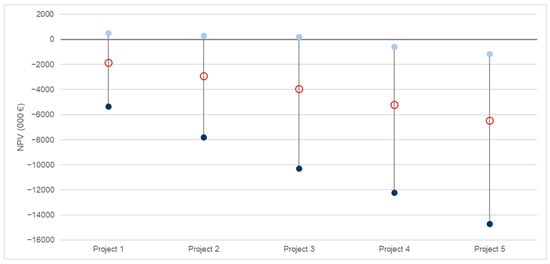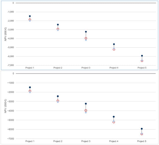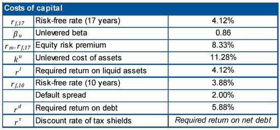 Market data. The market data refer to the costs of capital (required returns). They are necessary to calculate the NPV of each project and the NPV of each project’s area (operating, non-operating, equity, and debt). Specifically, the unlevered cost of assets (ku) is necessary to determine the operating value (and NPV) of the projects. It represents the minimum attractive rate of return (MARR) that justifies the project undertaking. Using the Capital Asset Pricing Model (; ), its calculation depends on the unlevered beta, the equity risk premium, and the risk-free rate: we use the estimates reported on the widely respected website of Prof. Aswath Damodaran (https://pages.stern.nyu.edu/~adamodar/New_Home_Page/home.htm, accessed on 20 November 2023), for the unlevered beta and the equity risk premium for the Environmental & Waste Services industry, and use the Italian 17-year government bond as a proxy for the risk-free rate. Since reinvestment in liquid assets will be essentially riskless, we use this rate as a proxy for the required return on liquid assets as well. For calculating the required return on debt, we sum the 10-year return on government bonds and the default spread for IREN, based on the BBB rating recently made by Standard & Poor’s.