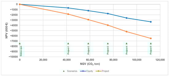 A given scenario (and, therefore, a given project) is determined by the choice of fuel type when replacing vehicles, distinguished by the following criteria: (a) selection and allocation policy (expressed in percentages that define the fuel-type choices for new vehicles), (b) starting year of the green policy, that is, the first year when the policy is adopted: before this year, vehicles are replaced with a new vehicle of the same type and fuel (status quo). The model starts with a set of 2303 inputs and produces two outputs: the economic value created by a given green policy (NPV) and the amount of reduction of CO2-equivalent (NGV) associated with that policy. We investigate how the change in NGV caused by a change in the replacement policy adopted reflects in a change in the NPV. For this type of analysis, having the goal of studying the economic and environmental impact of green policies on vehicle replacement, and upon suggestion of Iren Ambiente’s executives, we have made the following assumptions, with the aim of simplifying the problem (which is very complex in its entirety) and neutralizing the influence of other factors: