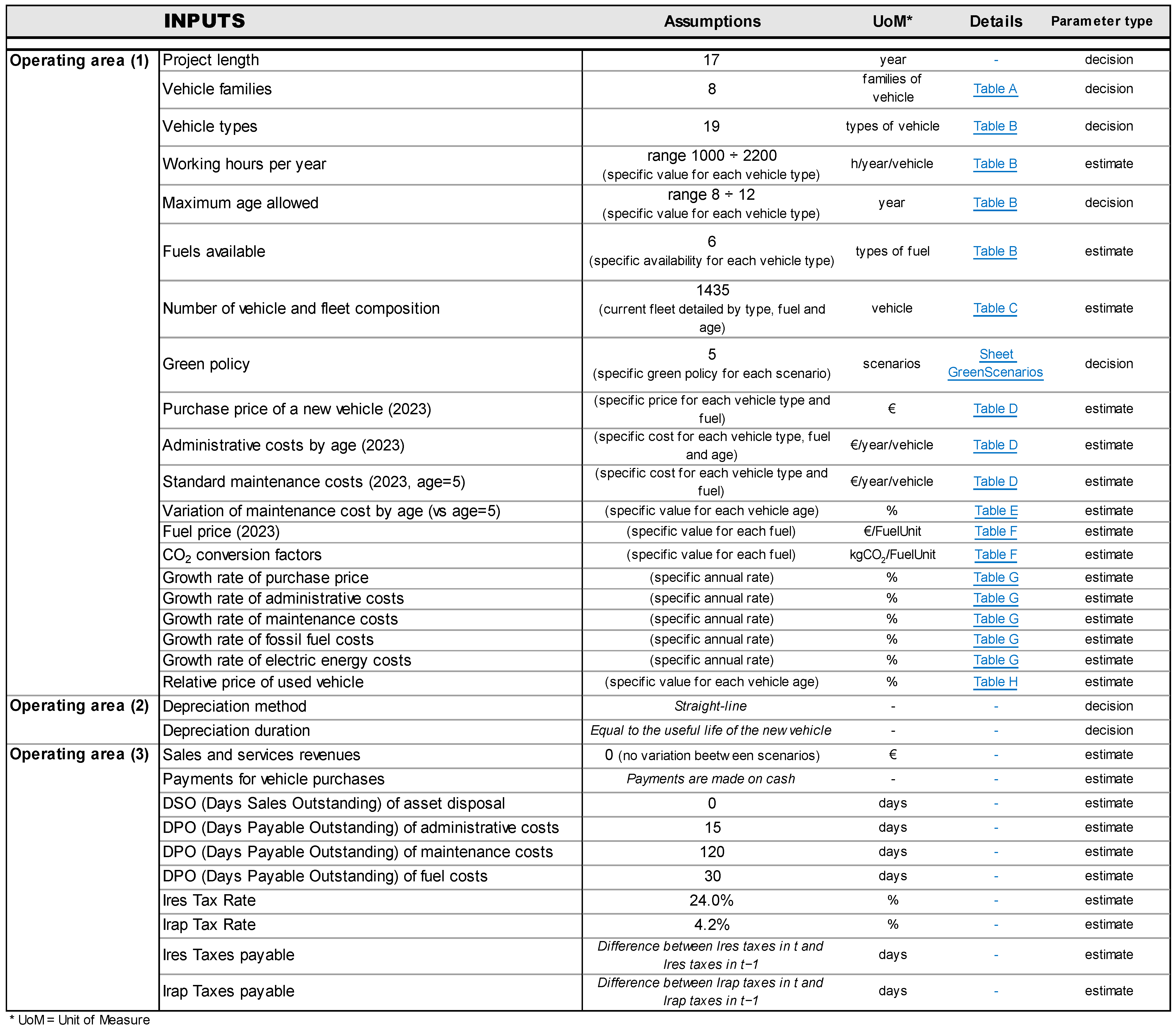 The outputs are divided into two classes: financial and environmental. The former comprises, for each business area and for each project, the total capital committed, the investment scale, the rate of return, the MARR, the financial efficiency, and the Net Present Value (NPV). The environmental output, directly derived from the Engineering Model, is given by the total CO