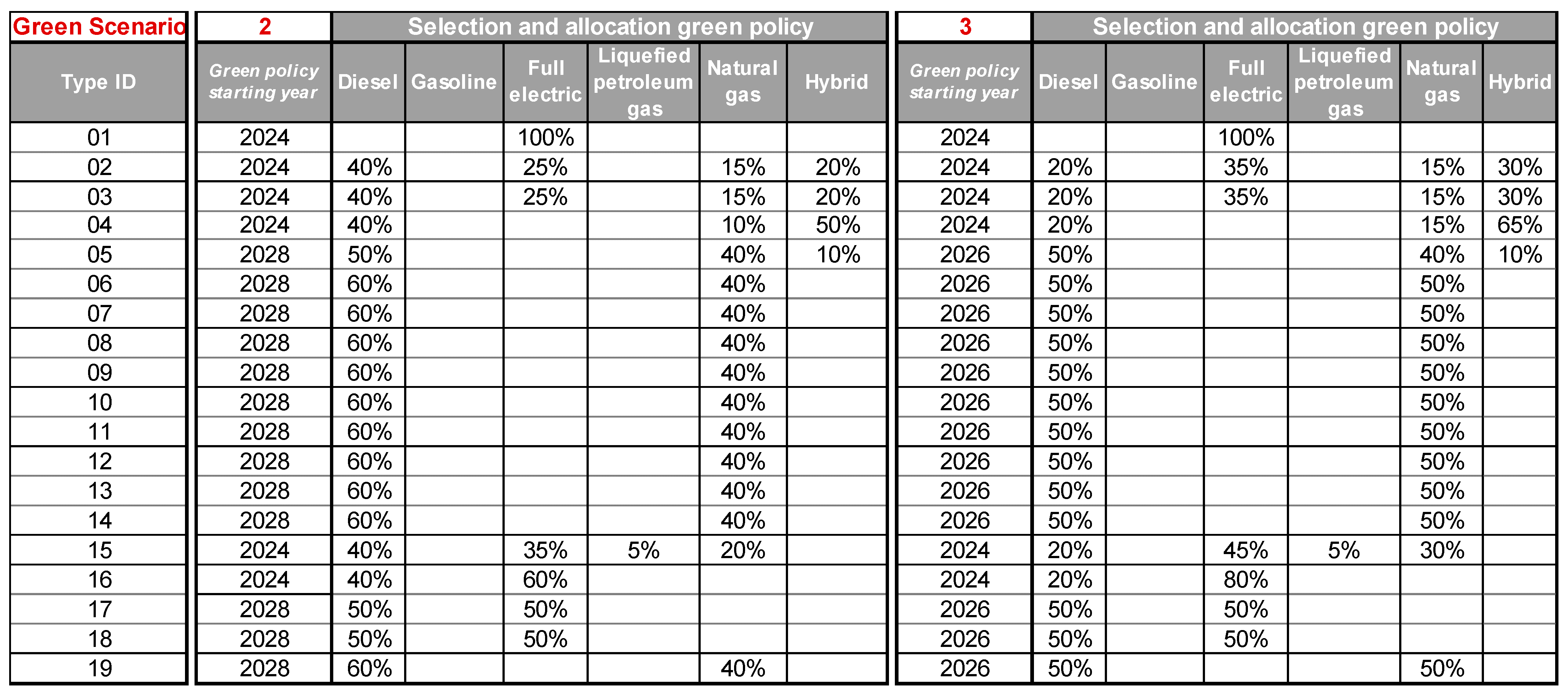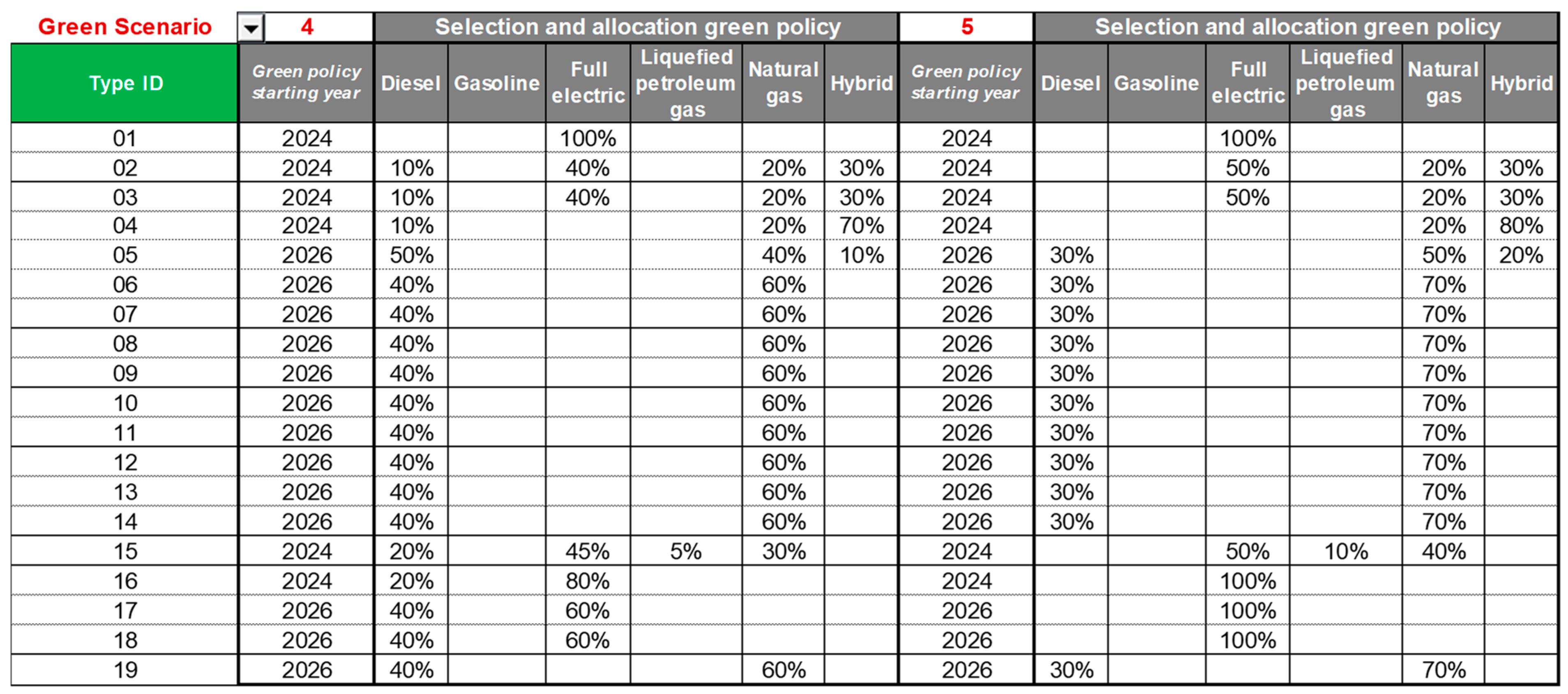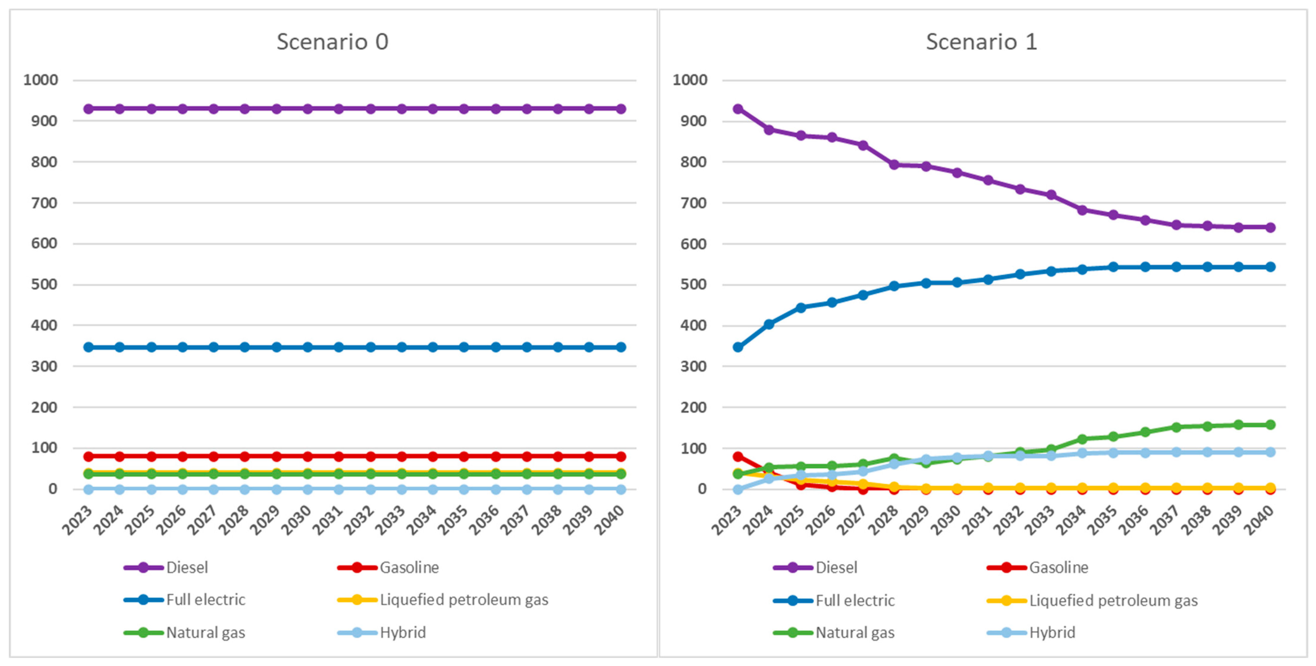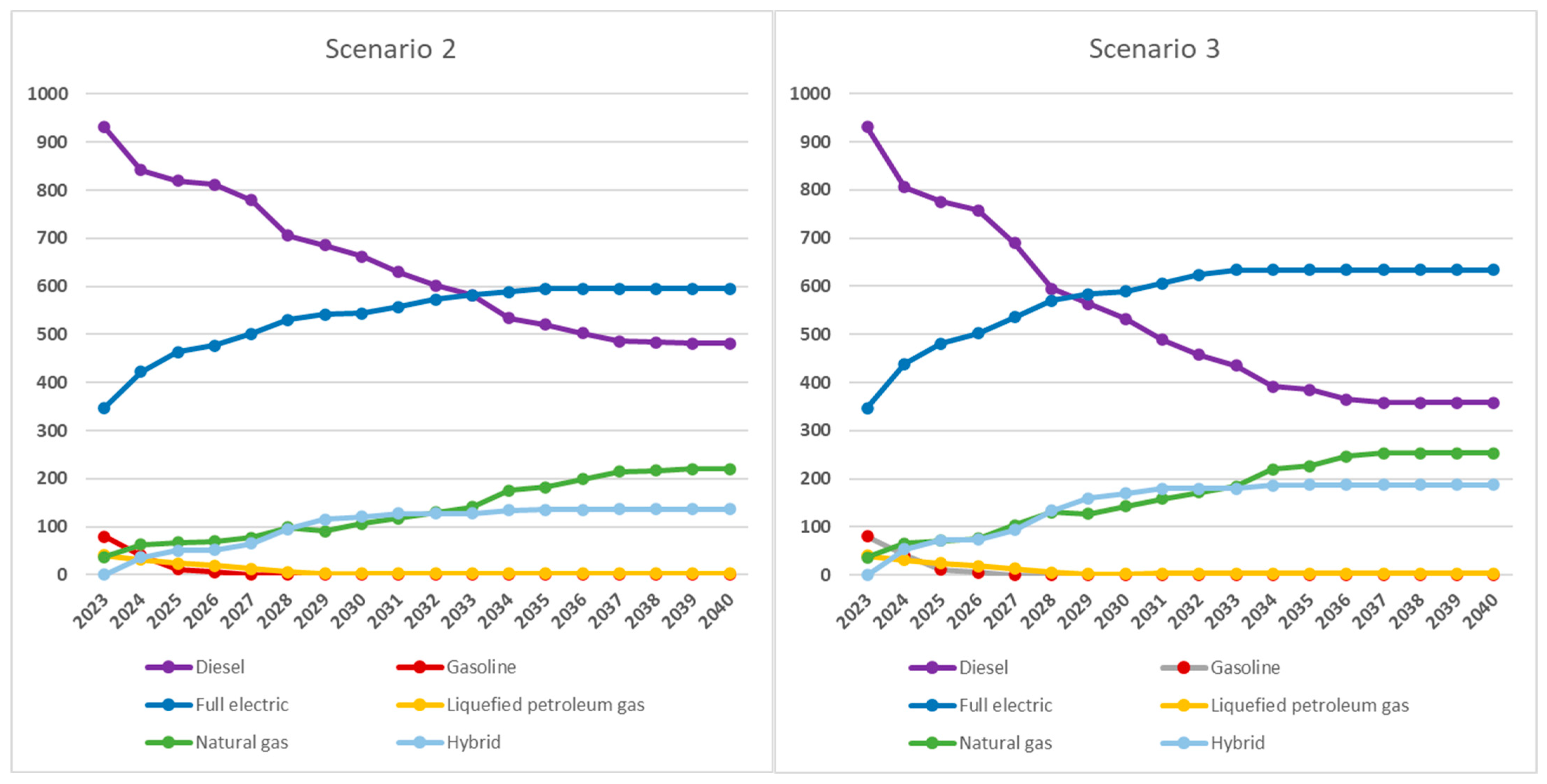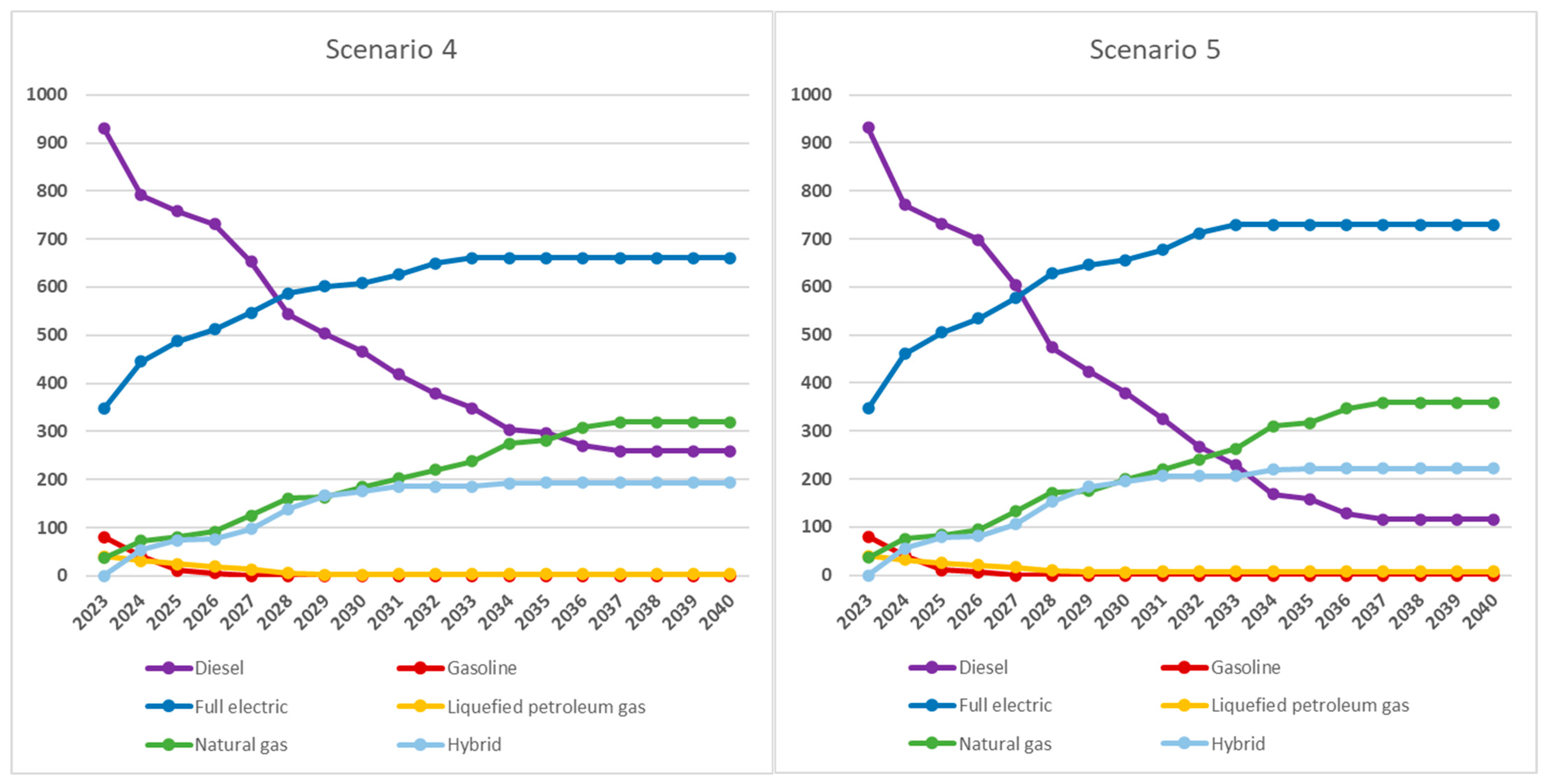 operational feasibility: a sudden shift to aggressive electrification (e.g., Scenario 5) would put pressure on maintenance personnel skilled in diesel engines, logistics (recharging cycles), and supplier capacity (bulk-order delays),