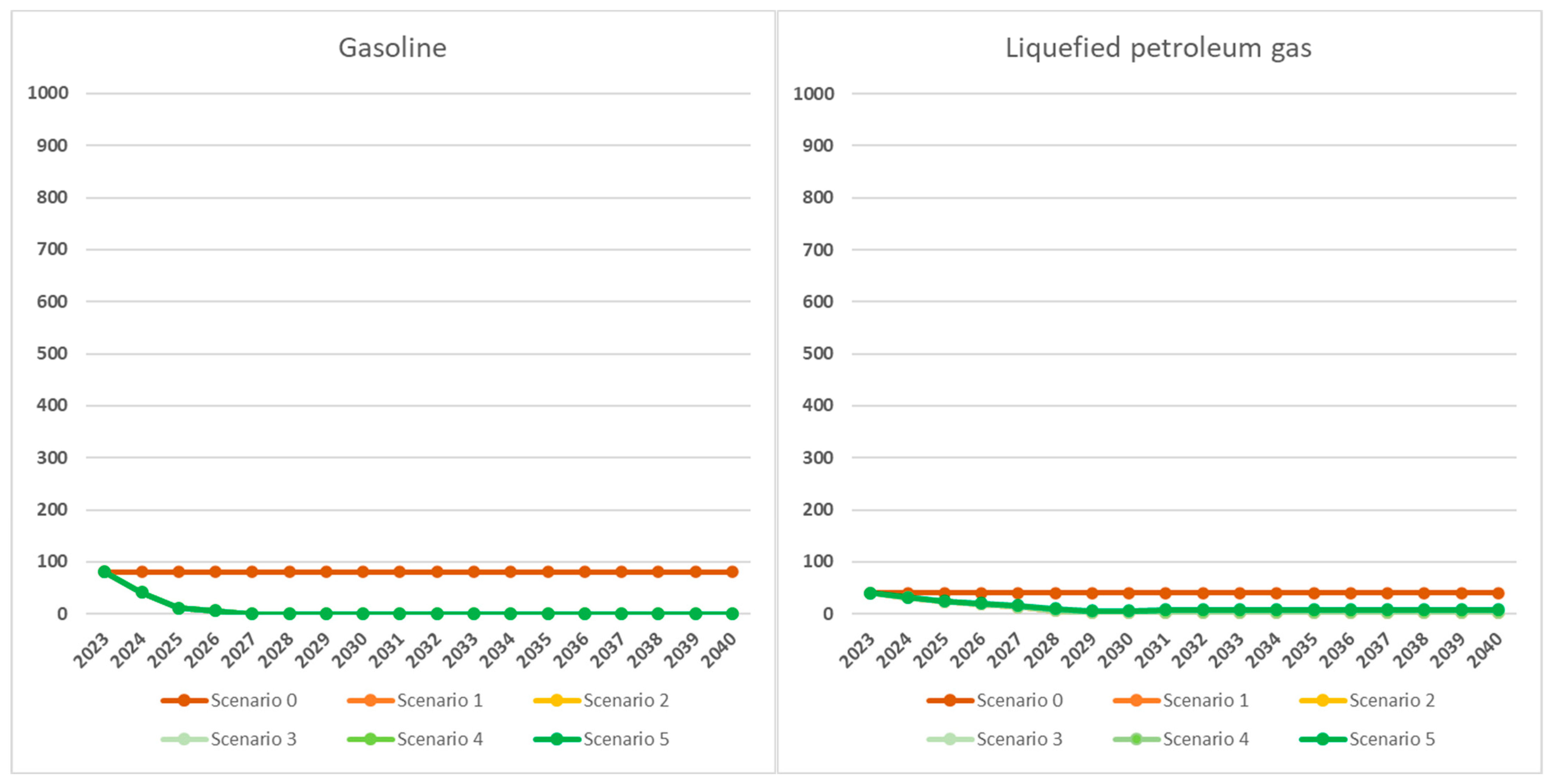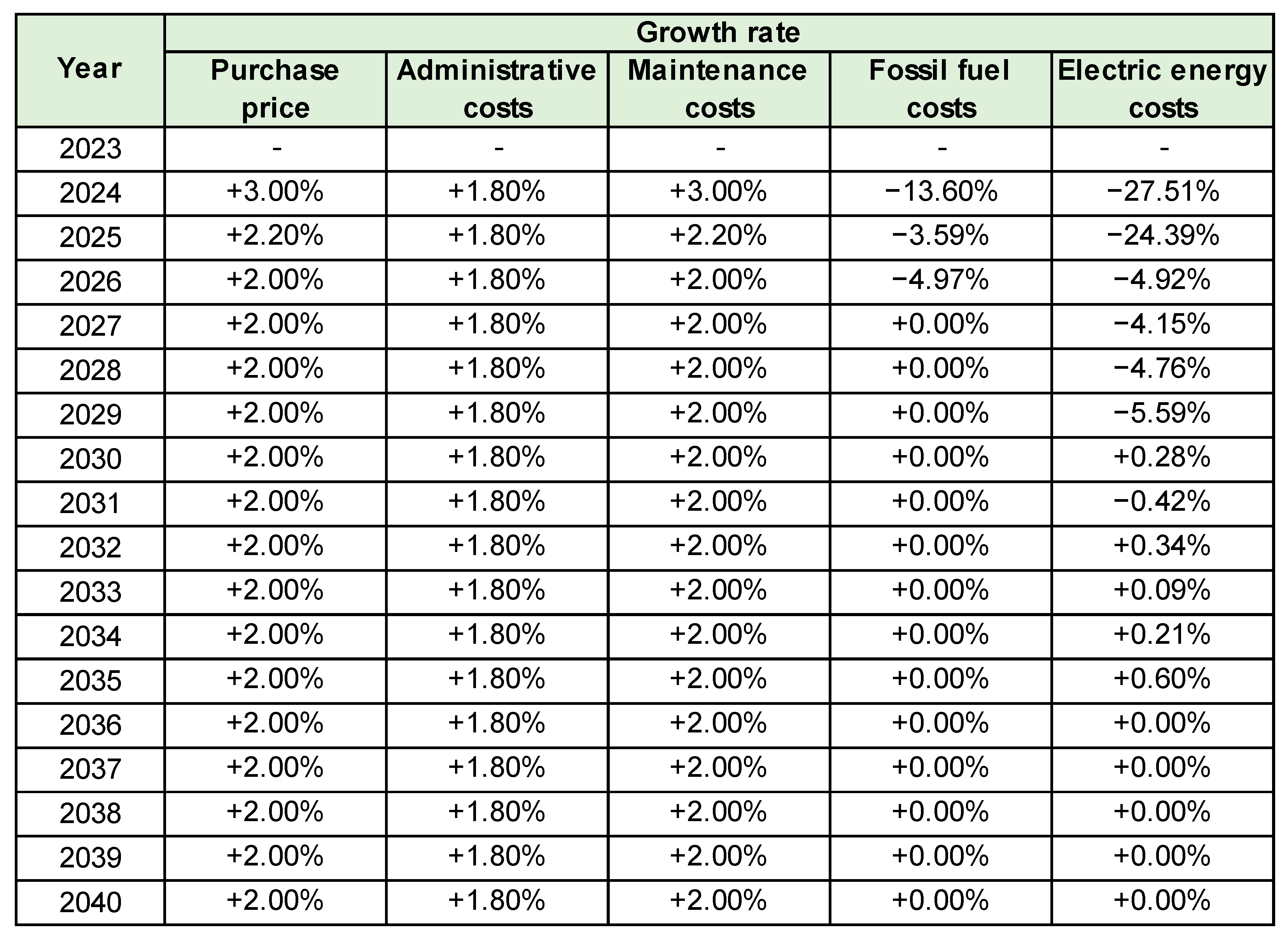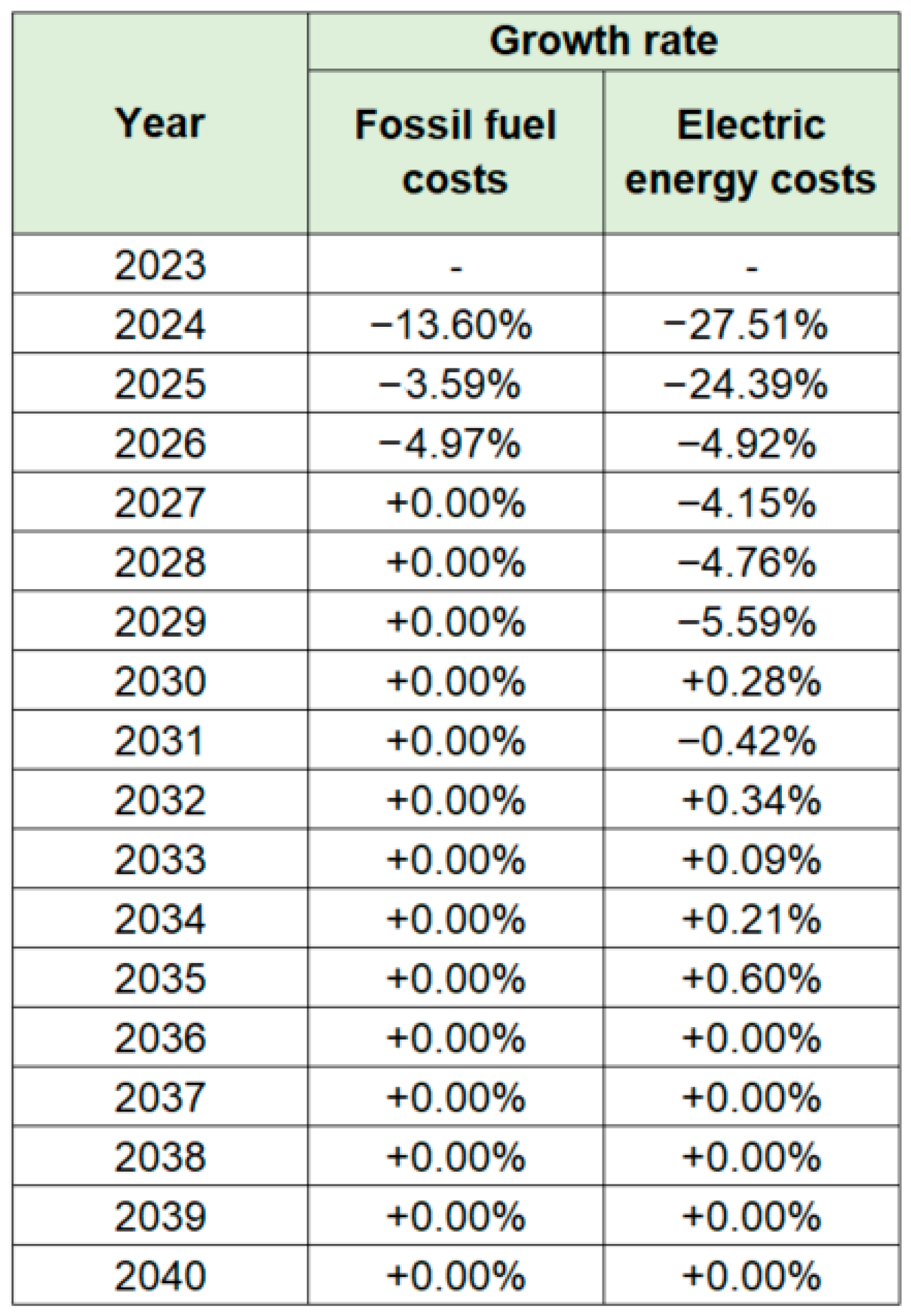 Figure 21 report, respectively, the fuel prices in 2023 and their projected annual growth rates, as provided by IREN. Unit fuel costs for the period 2024–2040 are calculated by applying the corresponding respective growth rates to the 2023 baseline values.
