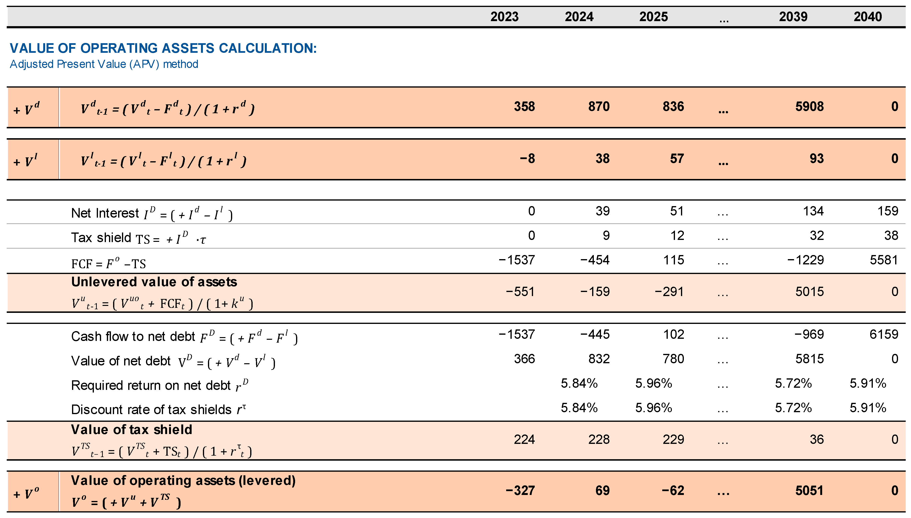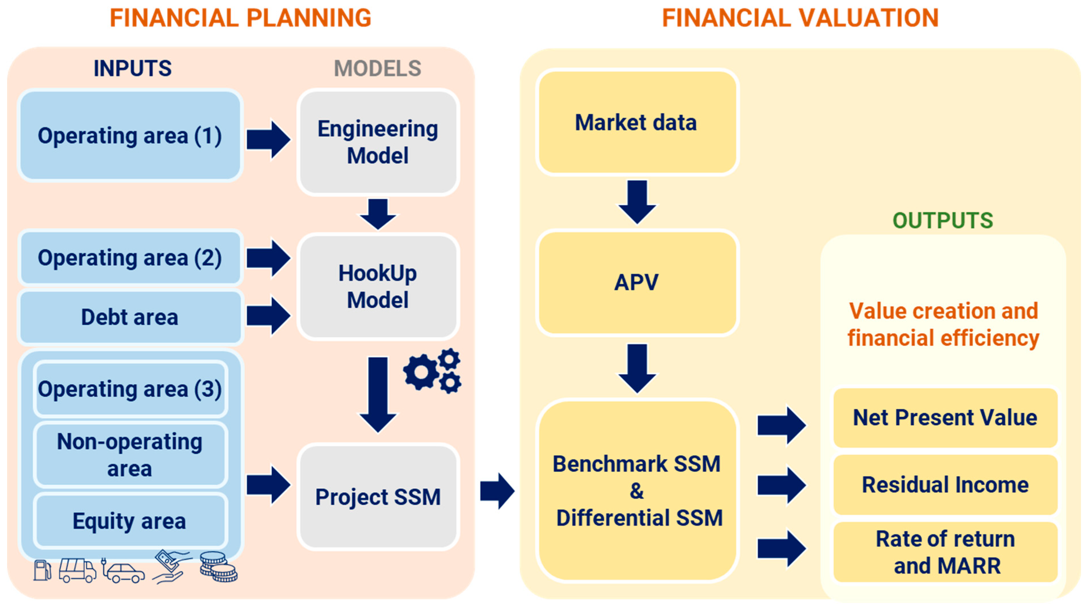 Financial model, which finalizes the financial planning and performs the financial valuation and efficiency analysis. For the construction of pro forma financial statements, we adopt the SSA and manage intrinsic operational risk using the well-known Capital Asset Pricing Model (CAPM). The market value of operating assets is assessed using the Adjusted Present Value (APV) method (
