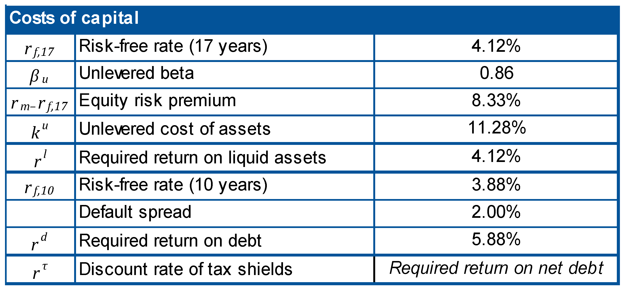 We begin with a sensitivity analysis of the main financial market input data: the unlevered beta (), the equity risk premium, and the default spread. For our case study, the estimated values are , Equity Risk Premium , and default spread . We refer to these values as the base case and analyze the impact on the NPV of both upward and downward deviations from those values. Specifically, we consider the following scenarios:
