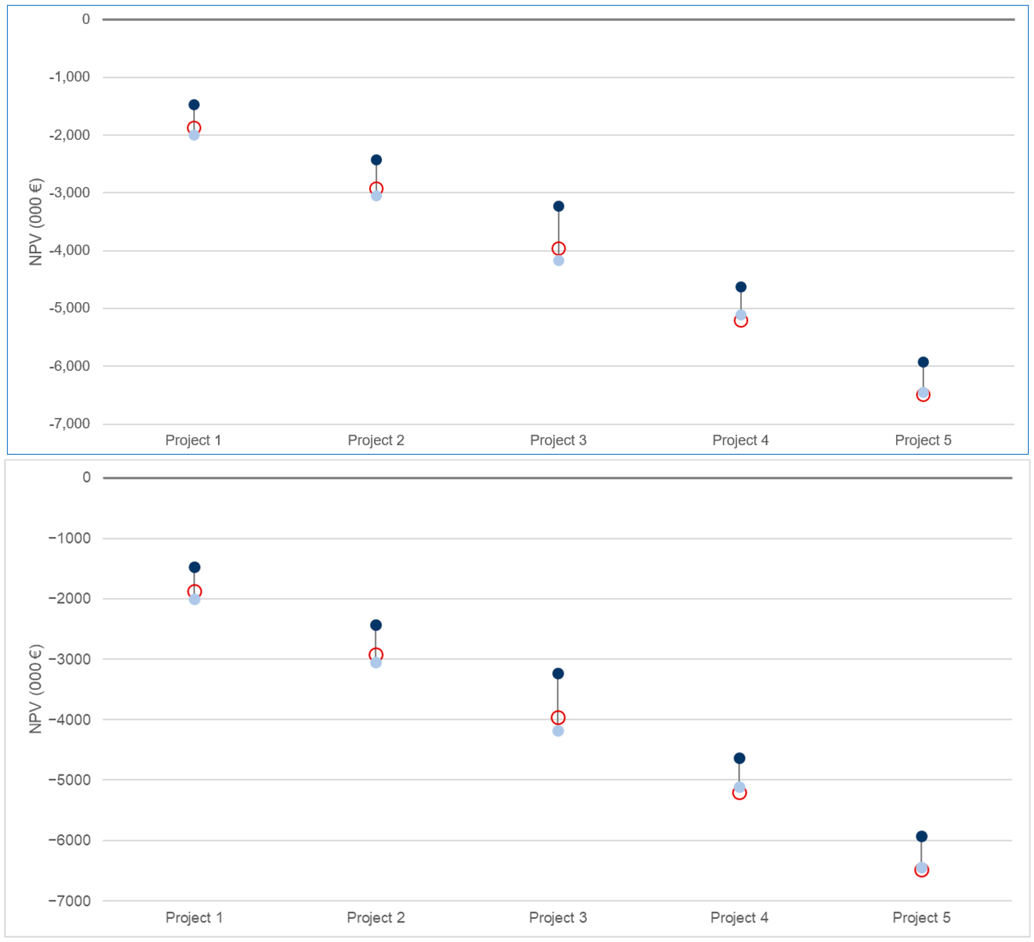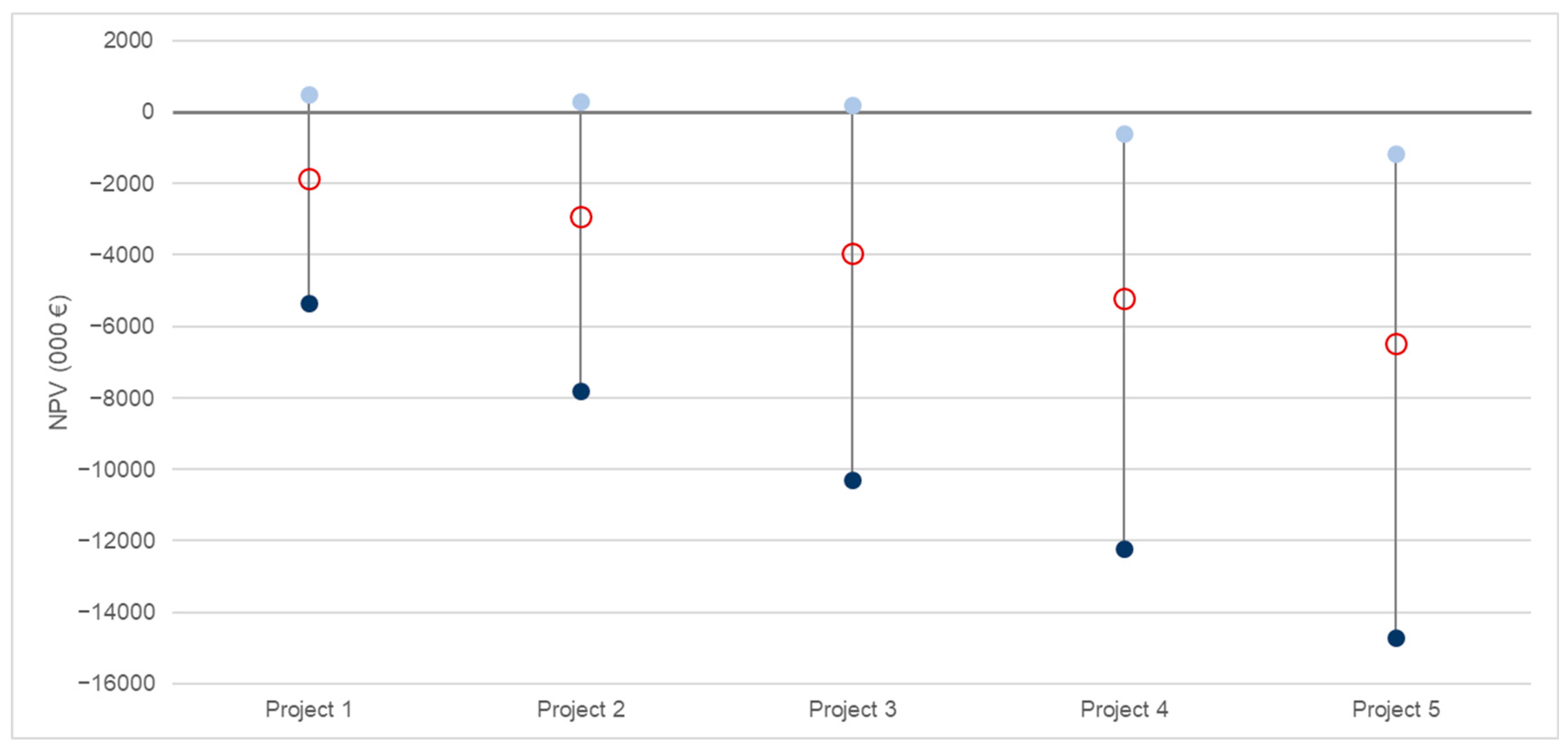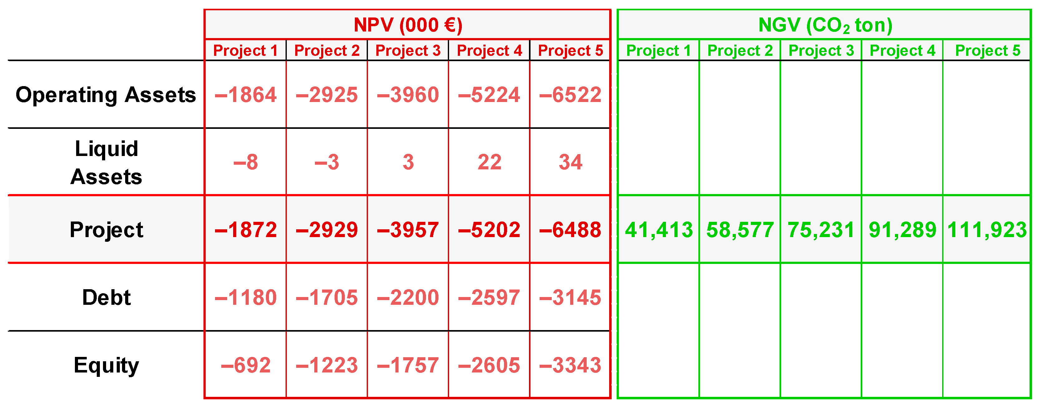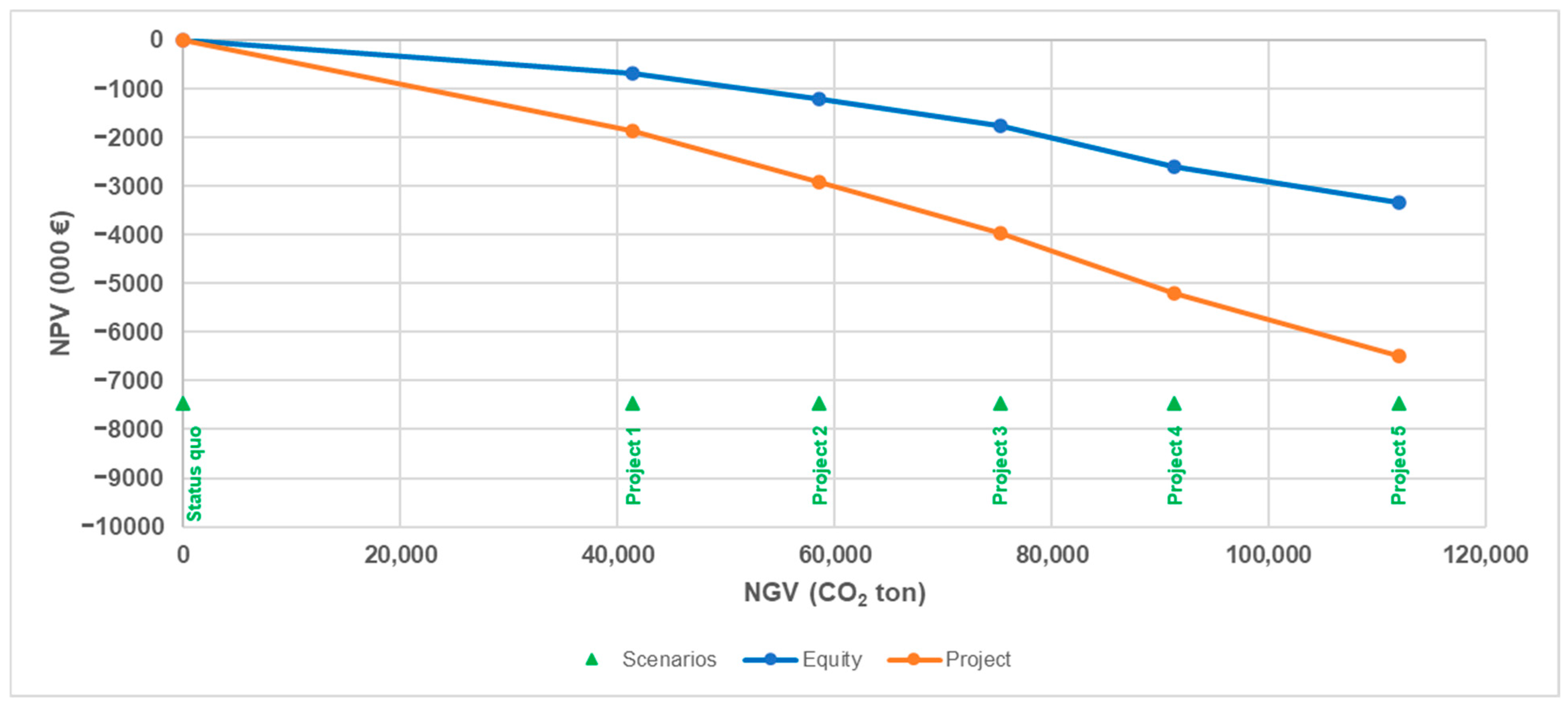 Figure 15). This curve associates the NGV (horizontal axis) with the NPV (vertical axis). Each scenario generates a project, and each project gives rise to a point on the curve, illustrating the project NPV and the project NGV (we report both the project NPV and the equity NPV). We note that, as the NGV increases, both the project NPV and the equity NPV decrease, indicating a decreasing relationship between economic value and environmental value: the pursuit of environmental gain results in a financial setback. Also, note that the NPV of each scenario is negative. More precisely, focusing on project NPVs (values in thousands of euros), the NPV of Project 1 is