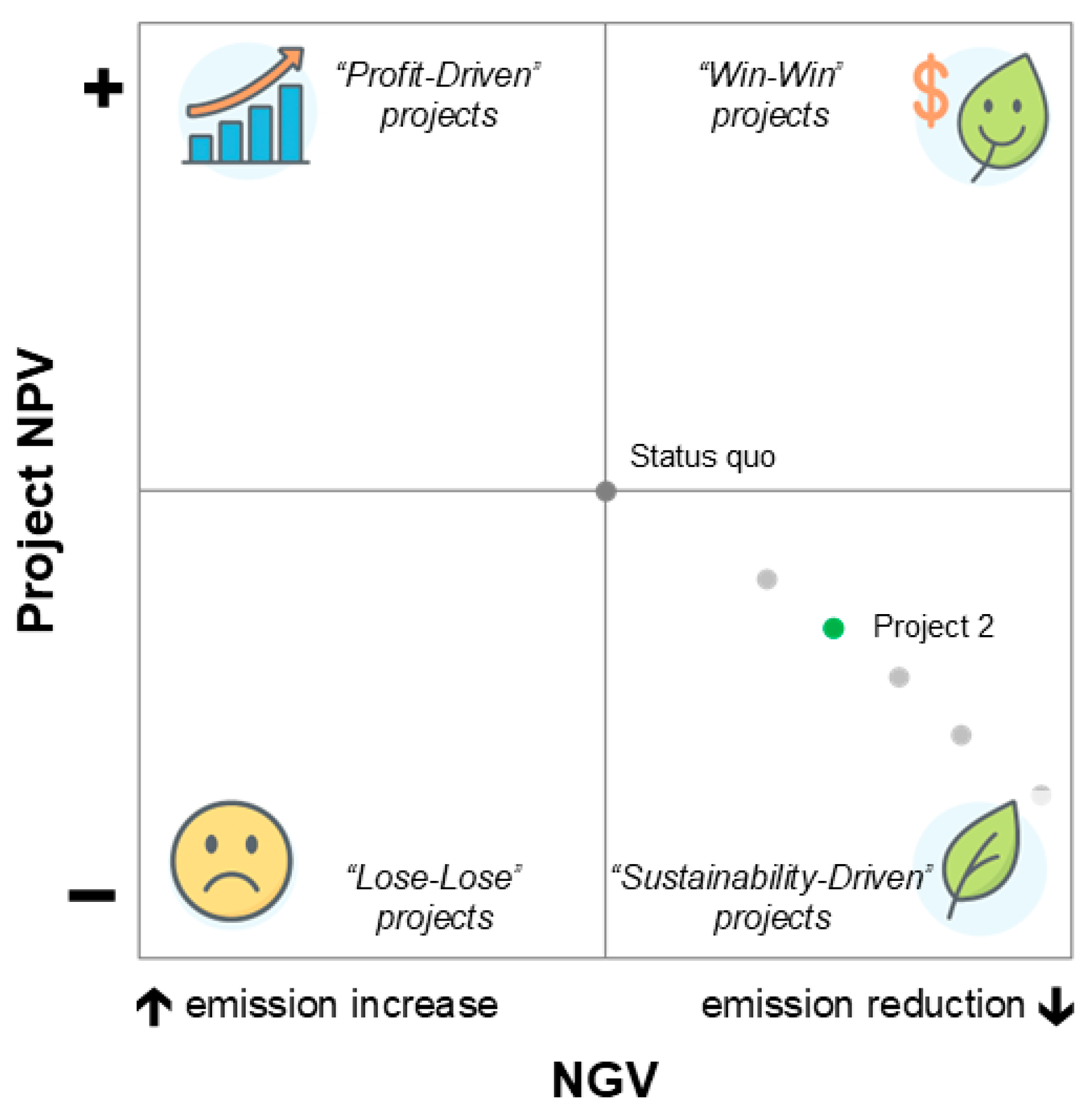 Bottom right—“Sustainability-Driven” projects: negative NPV but positive NGV, environmentally beneficial but not financially viable.