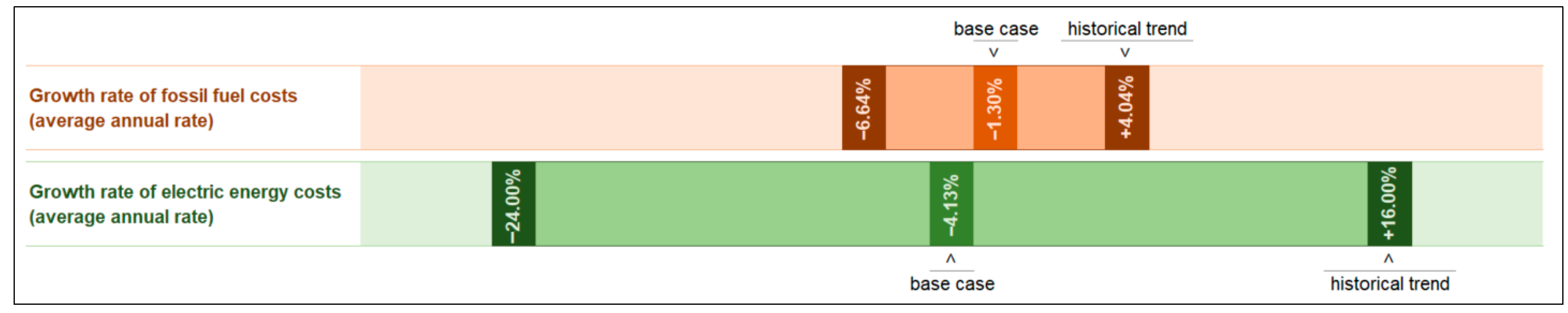 The base case assumes that both fossil fuel and electric energy will decrease over time. If, instead, the fossil fuels grew (by an average