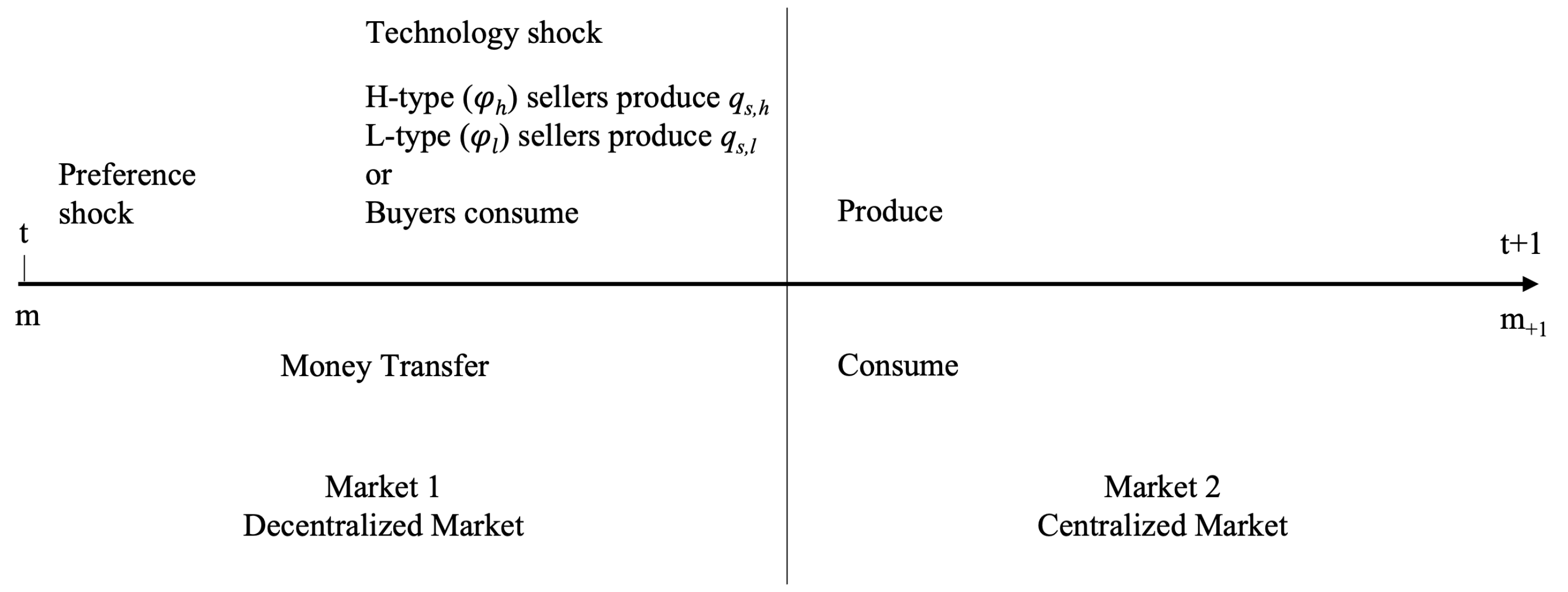 At the beginning of the first market, which is decentralized, each agent receives a preference shock that determines whether they are a producer or consumer in this market. Agents can consume or produce perishable goods in this market: they can produce but cannot consume with the probability , and can consume but cannot produce with the probability . In this market, agents who can consume are referred to as buyers, and those who can produce are referred to as sellers.